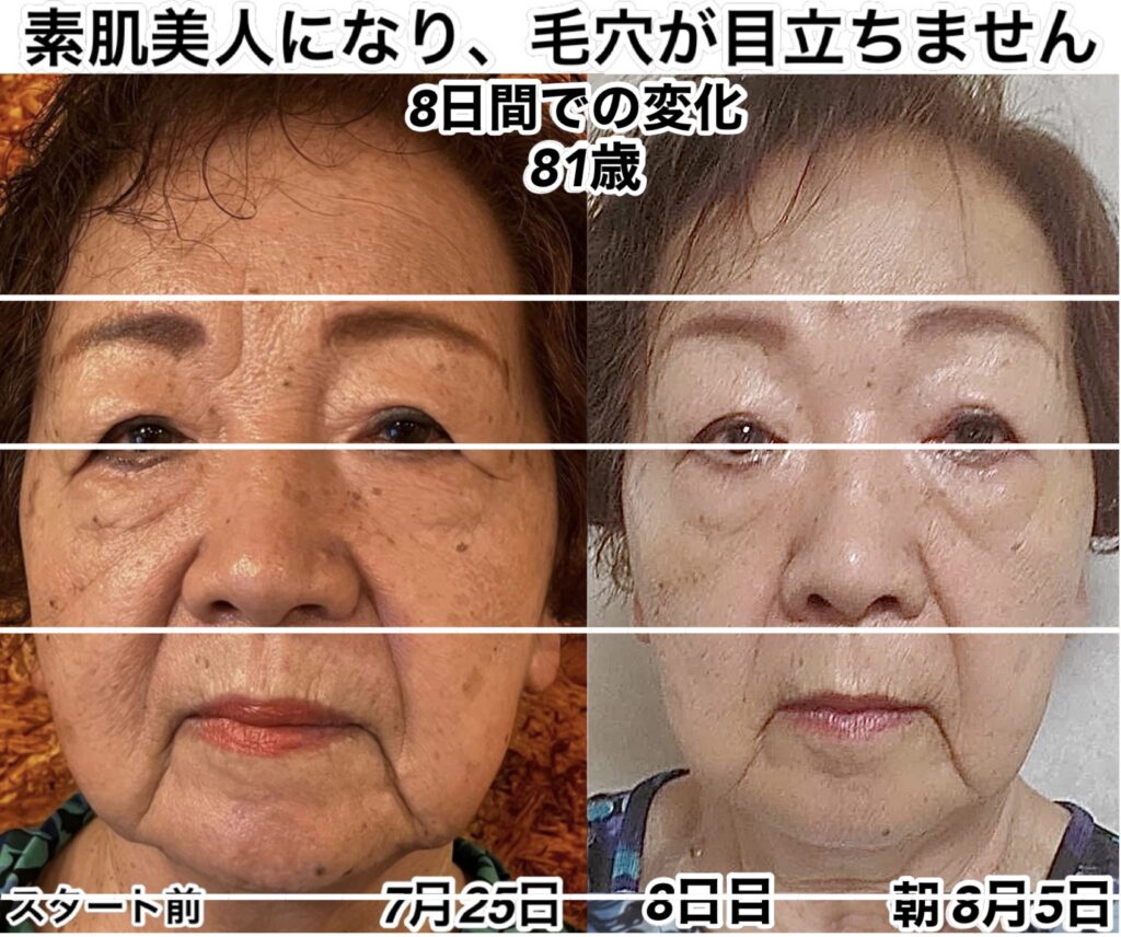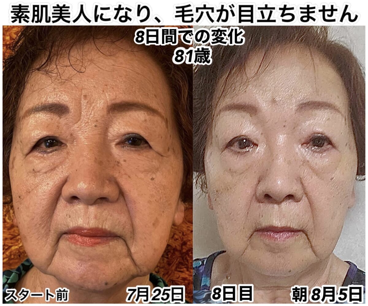 7/25の時点ではお肌の色と毛穴の部分を見て頂けると分かりますが、この状態が酸化の状態になります。いわゆる、いつガンになってもおかしく無い状態です。右側の8/5の肌ツヤと毛穴の大きさを見ていただけるとお分かりのように、こちらがアンチエイジングと言われる抗酸化をした状態になります。