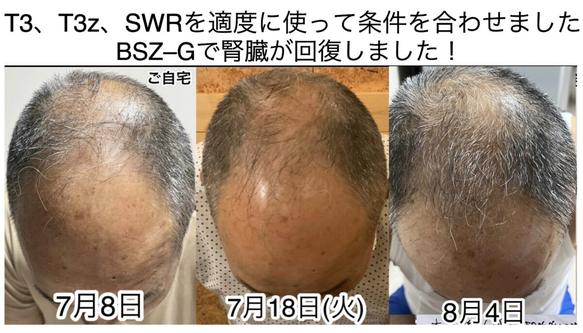 今は、腎臓を中心に「BSZ-G」で回復させていましたので、腎臓が機能を取り戻してホルモン分泌のバトンがきちんと渡っている結果になります。髪の毛が、薄い人やない人は、100%腎臓の何かが悪い証拠です。腎臓回復を避けて、髪の毛は治りません。毎日、健康な血液を輸血し続けた場合は例外ですが、それ以外髪の毛が治る事はありません。