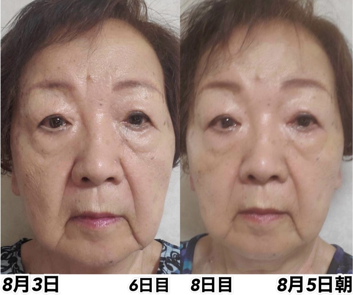 この素肌のまま、口紅の色を少しだけ濃くして、眉毛はそのままに、目の周りのアイシャドーやラインを少し入れるだけで、相当な美人さんに戻っている事でしょう。完全に小鼻になり、両頬のタルミの段差が無くなりました。全体的に小鼻になり、シワも減っています。かなりの若返り果たした結果。軽く10歳以上は若くなった印象を持ちます。お肌の白さが際立ち、色んなお化粧の仕方が浮かび上がるのは、僕だけでしょうか?色々な自分を演出出来るほどの若返りを果たしましたので、色んなお化粧にこだわって、マスカラなど目元を中心にイタズラをいっぱいしてみて下さい。全然違う自分が都度現れる筈です。