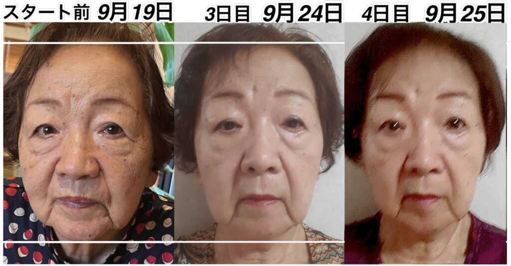 おでこの広さは老化だったことが伺えます。しかし若返りを始めたので、おでこが本来の幅に変わったため、顔全体が引き上がって目が大きくなってきました。アゴのほうも注目です。だんだん上がって若返りを急ピッチで始めています。鼻も小さくなってきました。肌も、酸化した肌から抗酸化されて美白になり、キメが細かく触るとスベスベする状態に変わっています。すでに別人です。今現在でおよそ8歳前後は若返ったのではないでしょうか。まだまだ変わります。楽しみですね。