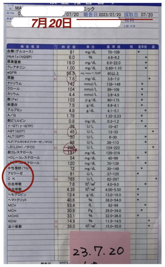 その結果、1週間後くらいに出てきた結果が、心臓の数値としての下記の『CK(CPK)』が“765”という通常の3倍に匹敵する異常数値が出ました。ここで、この血液検査のCKを判断する為に、何度も色々な病院へ行きましたが、数値を表記してくれませんでした。