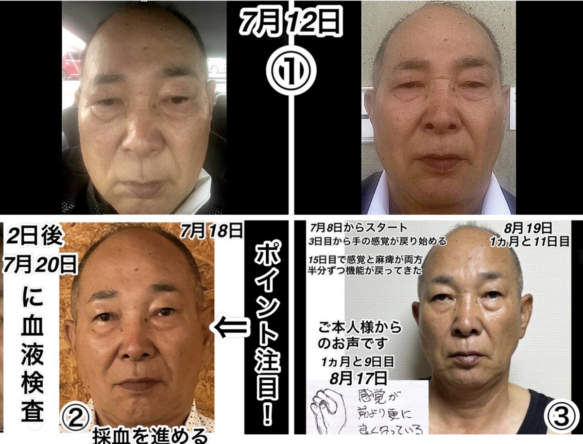 今回の問題は、②です。この時に、①〜②へかなりの改善が姿形で見られたので、血液検査を勧めました。