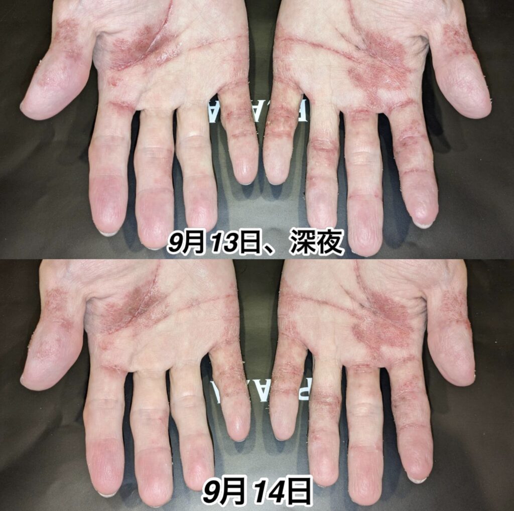 夜中に汗でかゆみが始まり、掻きむしってしまいました。しかし、朝起きた時に、いつもより回復しているのを見て、身体が活性され、超回復出来た事を実感していました。
