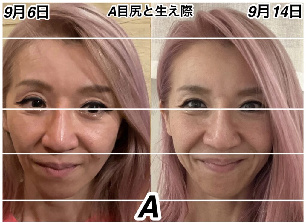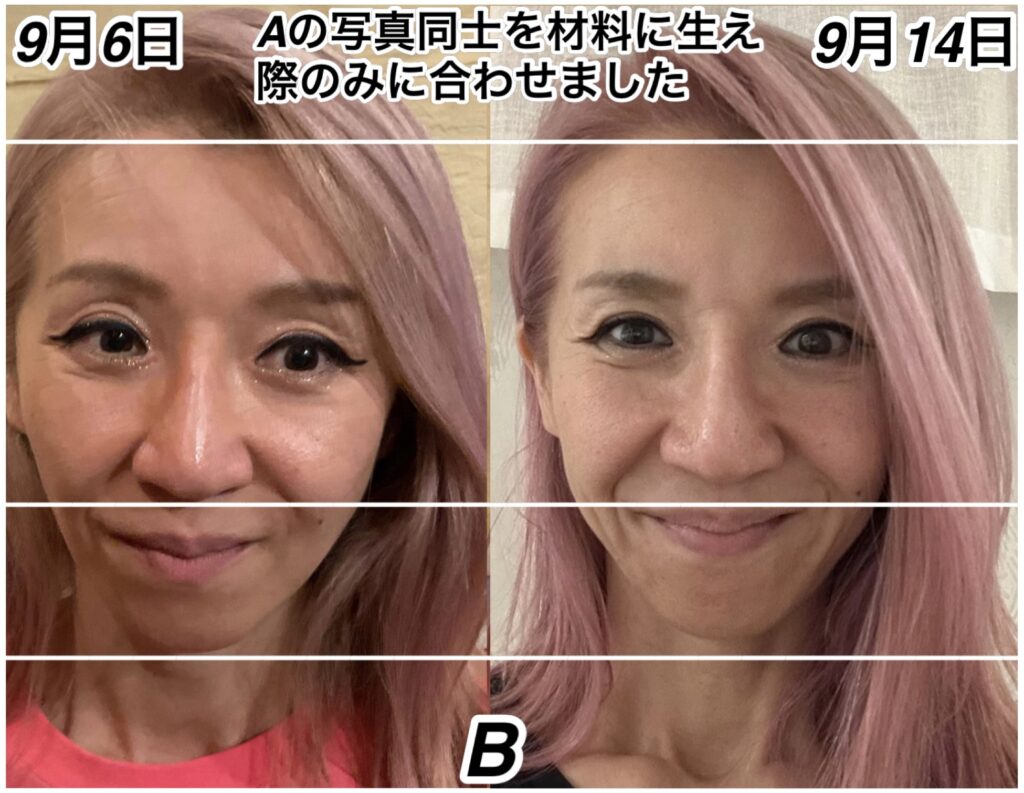 アゴの方が下にいっているように見えますが、実はおでこが狭くなっているため、目尻からおでこのLINEに合わせきれなくなってきてます。