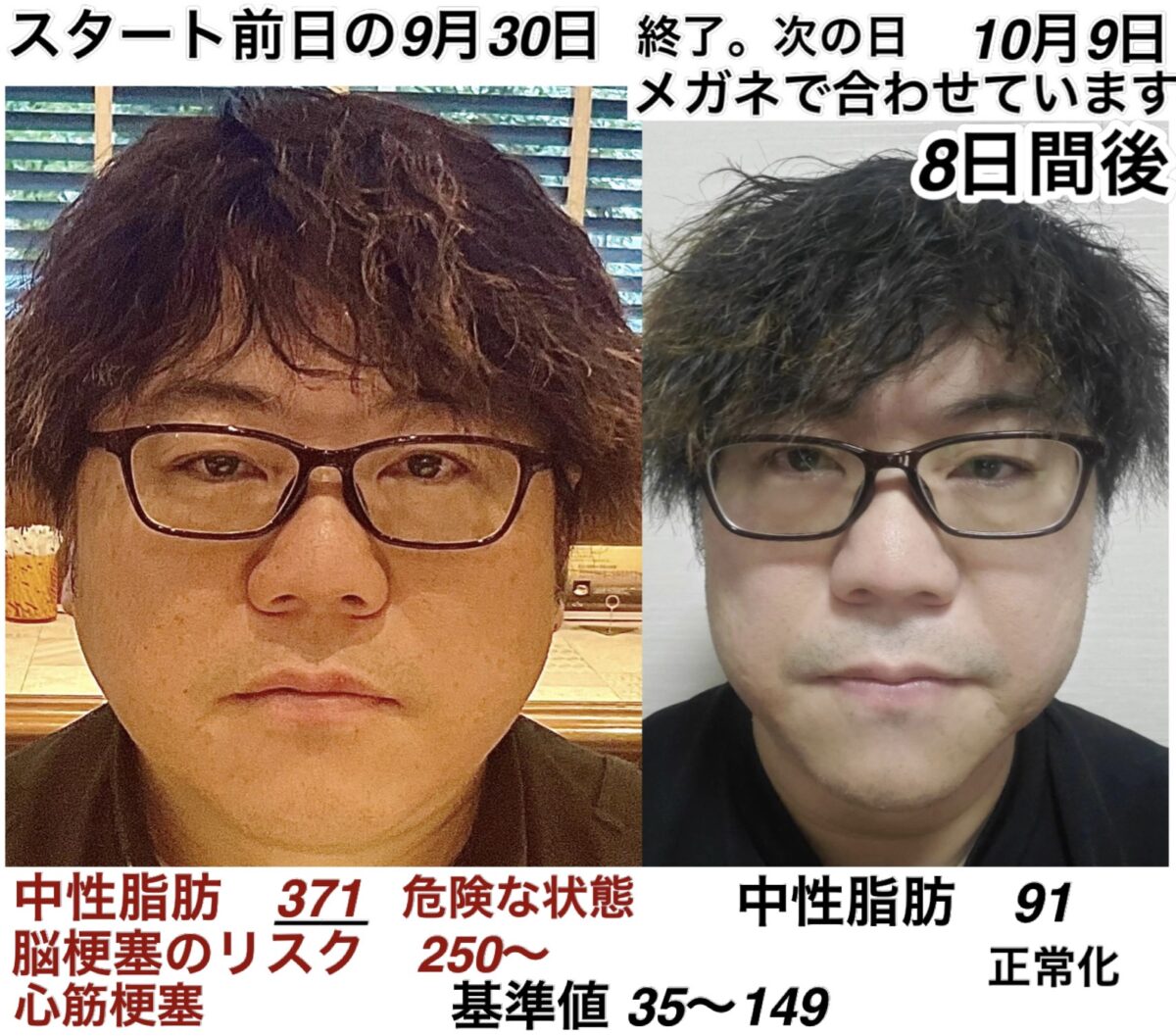 お仕事で踏ん張る事が命の危険でした。脳梗塞や心筋梗塞は、中性脂肪250くらいから、色濃く発生します。基準値はMAXが150くらいなので、当然です。よく死なないで371の数値で生きていられましたね。血液検査を拝見した時に、こちらが心筋梗塞になるかと思いました。