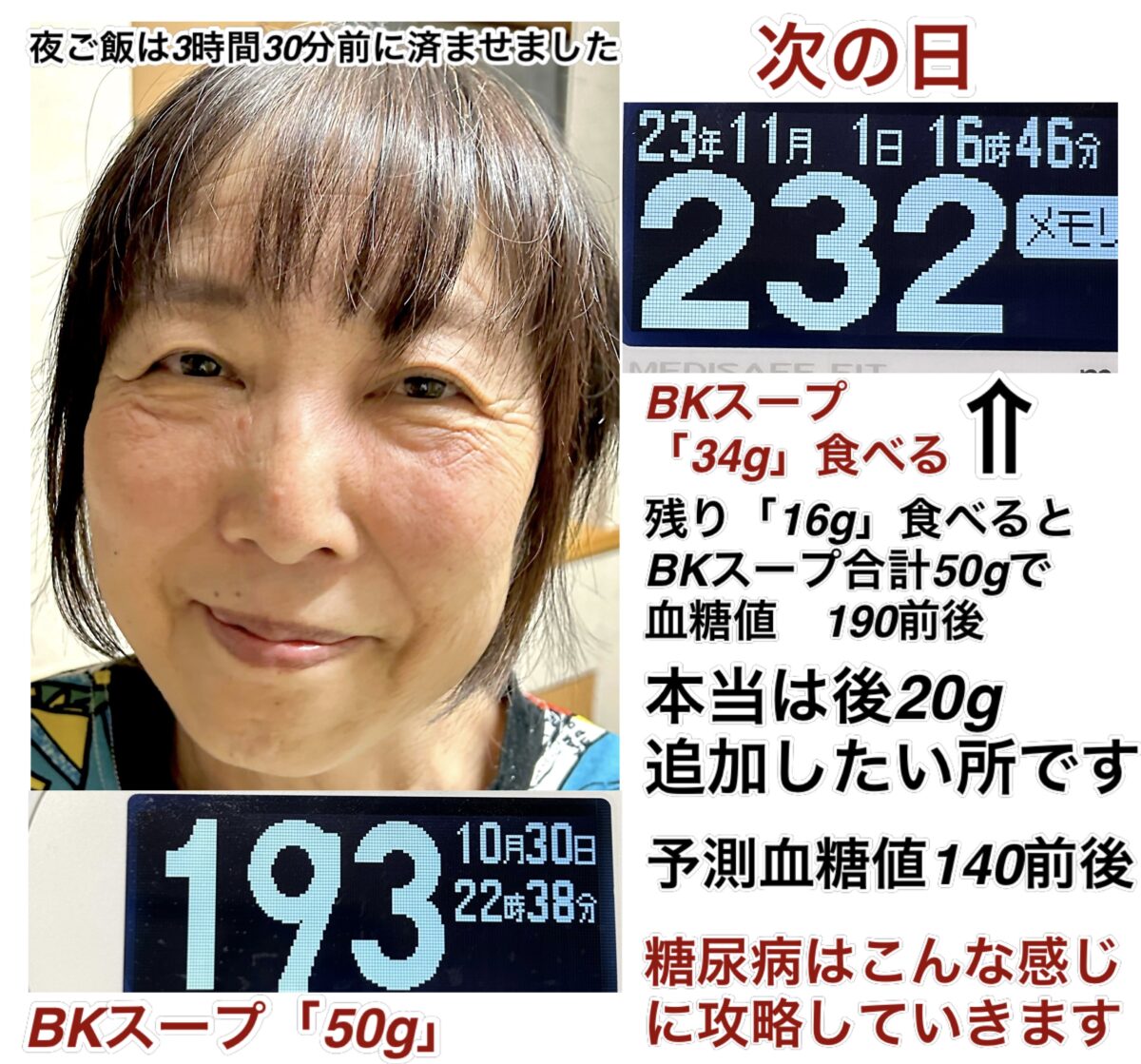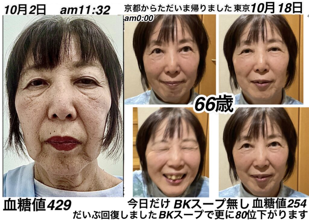 上記のお客様は、BKスープを毎日50グラム食べていますが、3回に分けて食べているため、11月1日の次の日は、まだ2回分しか食べていない状況で測定しています。きちんと50グラム食べると、寝る前には190前後に血糖値が下がっている状態になります。本当は、あとプラス20グラム追加して食べていただきたいところです。その場合の予測、血糖値は140前後になるのではなかろうかと思われます。しかし、すでに足の毛細血管たちが細くなり、目詰まりを起こし、壊死の前段階にあるので、「GOT」と言う商品で、毛細血管の内皮細胞たちを活性化させ、血管の内側を急ピッチで治すことも同時にやっているため、予算がかかります。当然、すべての炎症を抑えるべく「81z 16zセット」、電解質の活性のための「ミネラル2.5」なども入れながら、インスリン分泌を補うための栄養素の入った同時に腸内環境をきれいにする「BSZ」、すべての肉体の材料である「T3」なども絶対的に必要なため、予算が限られ、バランスよく進めるしかないので、それぞれ現状の分量になります。特に彼女が体感しているものの1つとして、「GOT」がキーポイントで、1日食べないだけで歩けなくなると言う恐怖を体感で持っているようです。一つ一つの商品の役割が違うため、それぞれのお客様の感じ方は様々ですが、1日で体感できるほどの変化の違いを、それぞれの食材で、いろんな方たちが体感しています。これから、この糖尿病を改善するべく回復食事をとってもらっていますが、同時に、最重要課題が、歩けないほどの毛細血管たちの痛み、ダメージを直ちに改善し、日常生活を可能にするためのバランスが常に求められることになりました。足の毛細血管のダメージが、あまりにも対策を打たない時期が長かったために、麻痺と痛みでかなり深刻な現状です。そこまで深刻でなかったら、血糖値を下げるのみだったので、格段にこちら側としては楽でした。さらに低予算にさせることができたので、少し悔やまれる部分ではありますが、現実は甘くは無いので、今の時点で病院に入院すると、完全に出て来れない現状になり、お仕事を続ける社会性も失ってしまうことでしょう。それを全て維持しながら、日常生活を送り、なおかつ、全てを治していく作業を同時進行している現状です。血糖値429を改善するだけでも、病院ではできません。現状では、およそひと月で、429の血糖値を190前後に維持することに成功しています。これからまだまだ下がっていく予定です。そんなハードルの高い問題を抱えながらの改善になります。元々持った美しさも取り戻してきてよかったですね。今のところは全て順調といえます。引き続きがんばりましょう。
