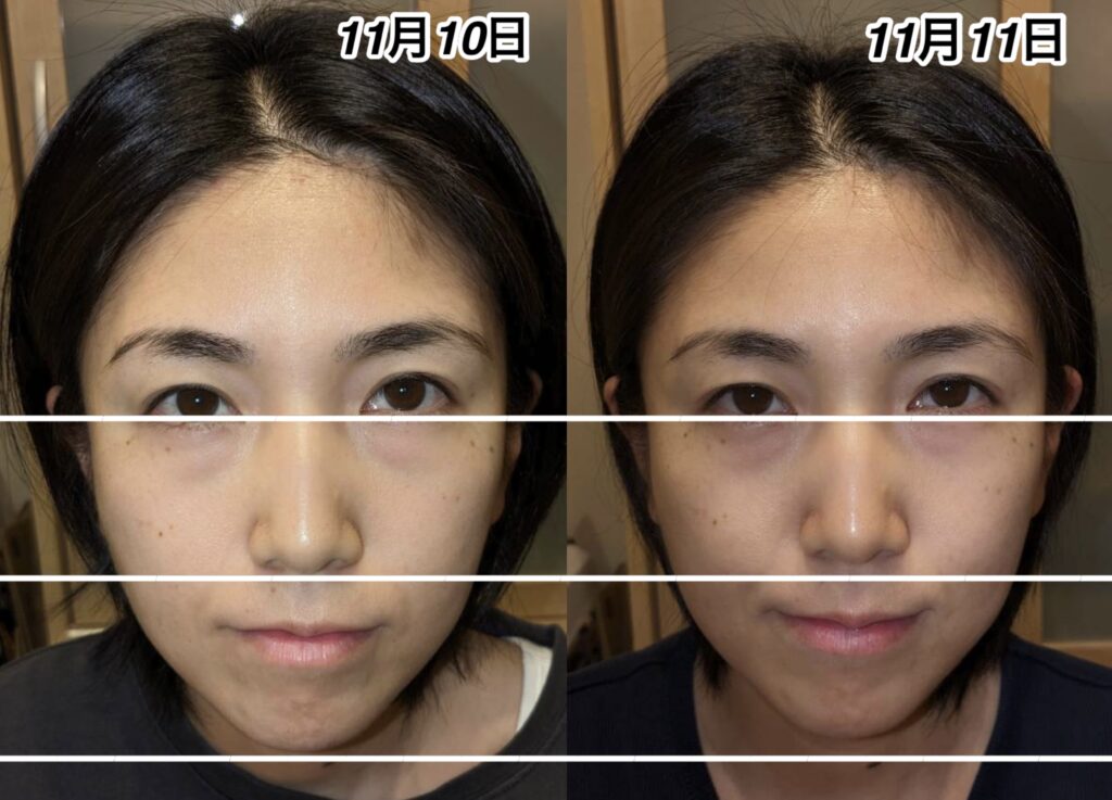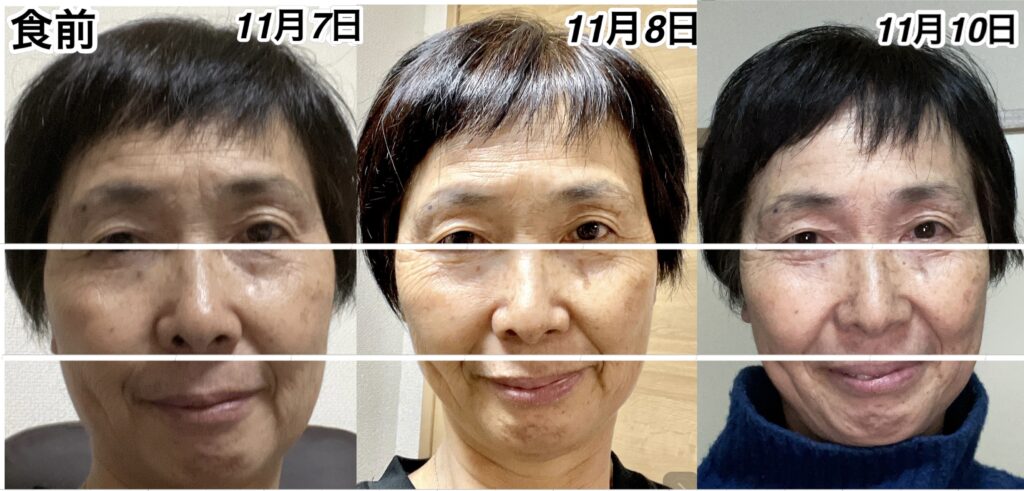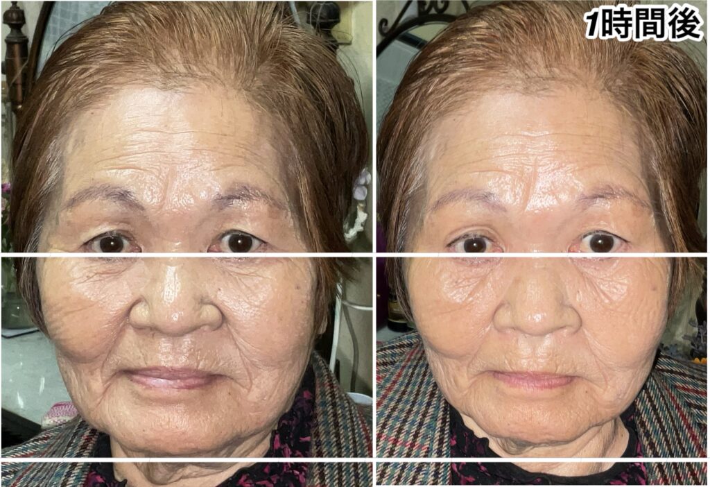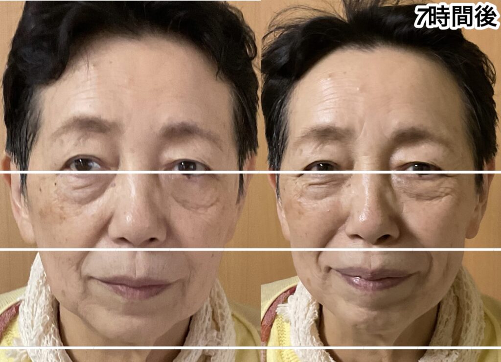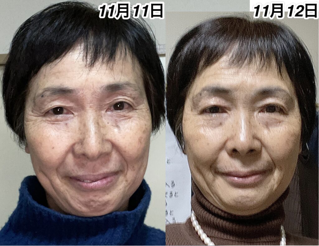 たった7時間で、ここまでの変化は、代謝が良い証拠です。体の中が若いと言う証拠です。今回は、滞りをなくすことが目的なので、もう目的は果たされました。素敵に若返っていますね。あごのたるみがなくなっています。鼻の高さも上がり、耳も上がっているので、活発的に可愛く見えています。