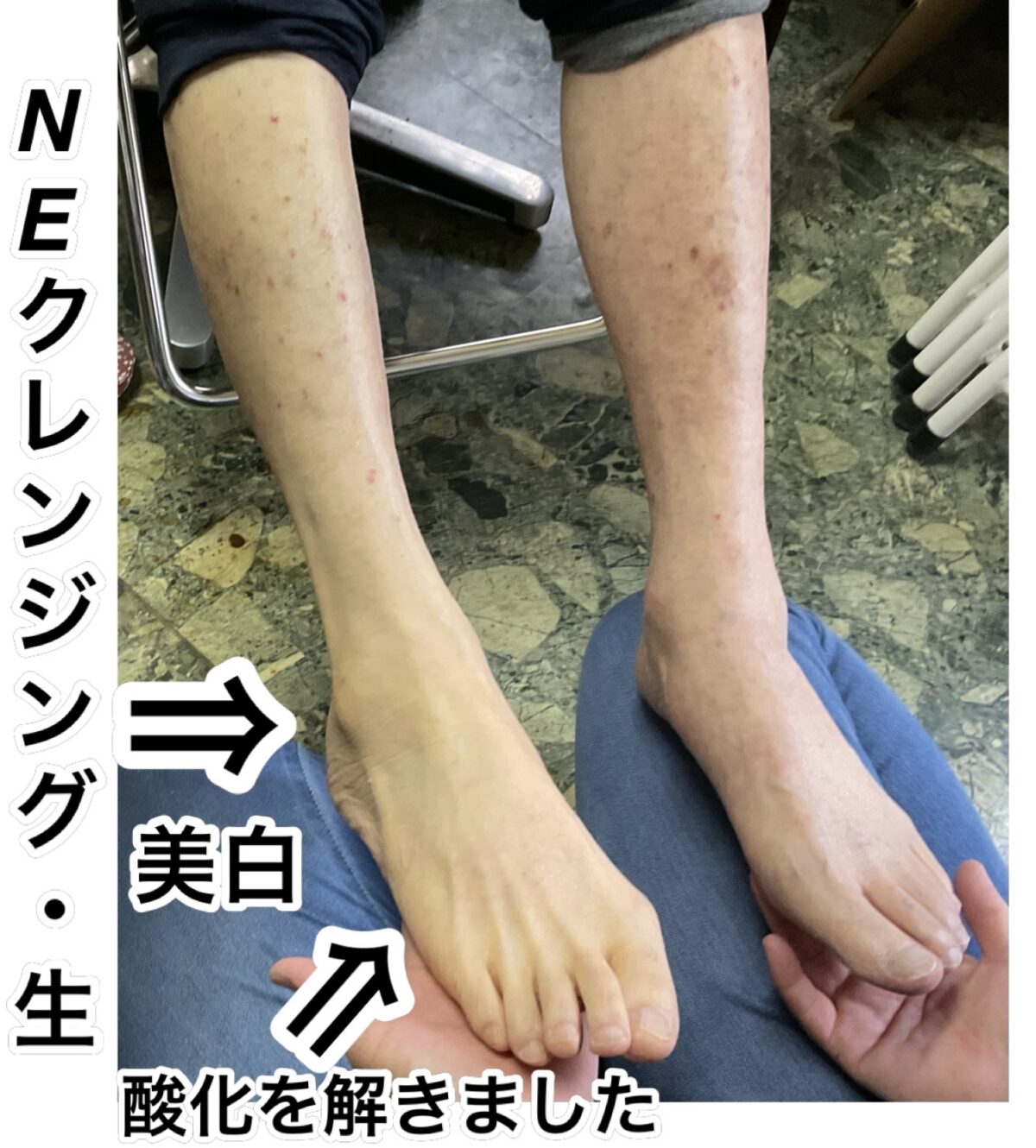 「NEクレンジング生」をマッサージしながら塗りこみました。酸化を解いたので一気に美白しています。