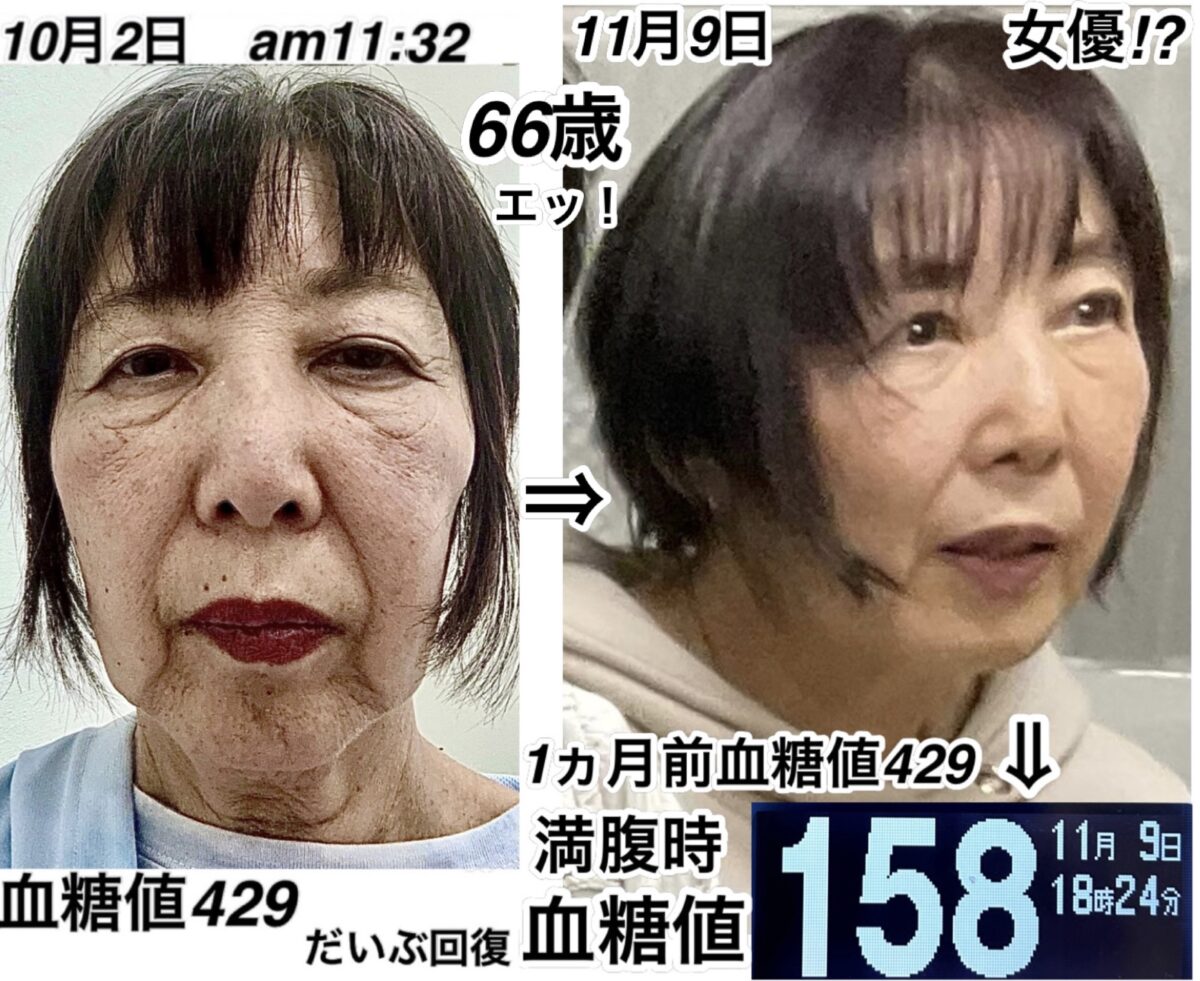 順調回復、よかったですね。引き続きの回復を先手で勝ち取りましょう。チームワークが生死を分けます。。血糖値の問題よりも、毛細血管の回復の問題の方が、現実的に時間がかかるので、しばらく気は抜けません。世の中では、この毛細血管は回復しないと言われています。なので麻痺はずっと残ると言うことになっています。一矢流では圧倒的に短期間で治っている方たちしか居られません。100%治るかは分かりませんが60%以上は、早い段階で、皆さん回復に変化しています。 通常の通常の世の中の病院などでは、インスリン等を使わなければこの血糖値すら変化させることはできません。いわゆる根本解決ではなく、インスリン投与で解決。それが効かなくなった時が、深刻な状態であり、毎日インスリン投与を注射器ですることがリスクになります。一矢流はお惣菜を食べるだけで解決しています。引き続き頑張りましょう。