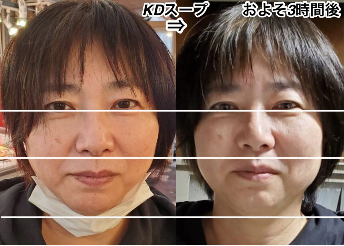 もうすでに数時間で若返っています。これをご本人様が感じて、体調も良くなったことと同時に、「KDスープ」を気に入っていただき、またご来店して頂きました。今度は少しだけ本気の、さらに美しかった時の本当の自分を取り戻すために、再度開始し始めます。相当変わるはずですよ。血糖値もすぐに下がります。安心して血液検査に行ってください。どれほどの美貌が戻ってくるか楽しみですね。乞うご期待。