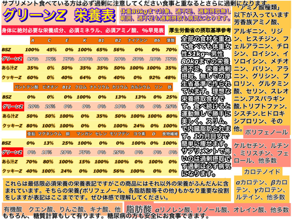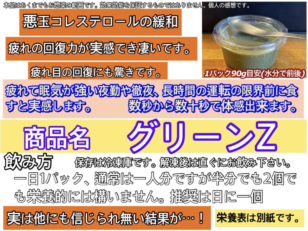 ○グリーンZ(お惣菜)糖質4.46g…これもかなり重要な回復を促す部分での主役の1人です。この栄養たちの協力があるだけで、疲れにくく、視力改善、体重変化を体感される方が非常に多い商品です。3時間くらいの残業なら、残業が始まる前に食べて頂けると残業は無かった事に。徹夜等もかなりの助けになる心強い商品です。これは、みなさんが毎日食べてしまうくらいの体感をする商品なので、手放せない方が多くリピーターの多い商品です。糖尿病対策品。