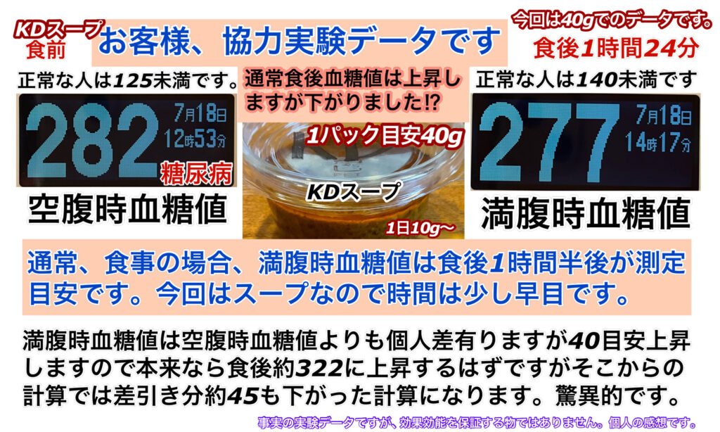 ○KDスープ…リーズナブルを可能にした究極傑作の一つ。これは、一矢流抗酸化回復食事のコアの一つであるBKスープを元に、力を残しながら、どこまで安価にできるかを突きつめた一矢流の看板娘の1人です。40gが一つとしていますが、結果データにあるように、人によって分量で栄養効果がちがいます。一応目安的な物として、体重比率を表示してありますが、個々に身体の状態が違う為、一概にその分量とは言い切れません。なので多目に食べる事をおすすめします。これは、肌の調子の改善が期待できる栄養素たちや一矢流の本当の抗酸化を目的とし、作られたスープの素です。豆乳200mlと混ぜて飲んで頂きたい希望がありますが、忙しい方はそのままパックっと一口!でも構いません。