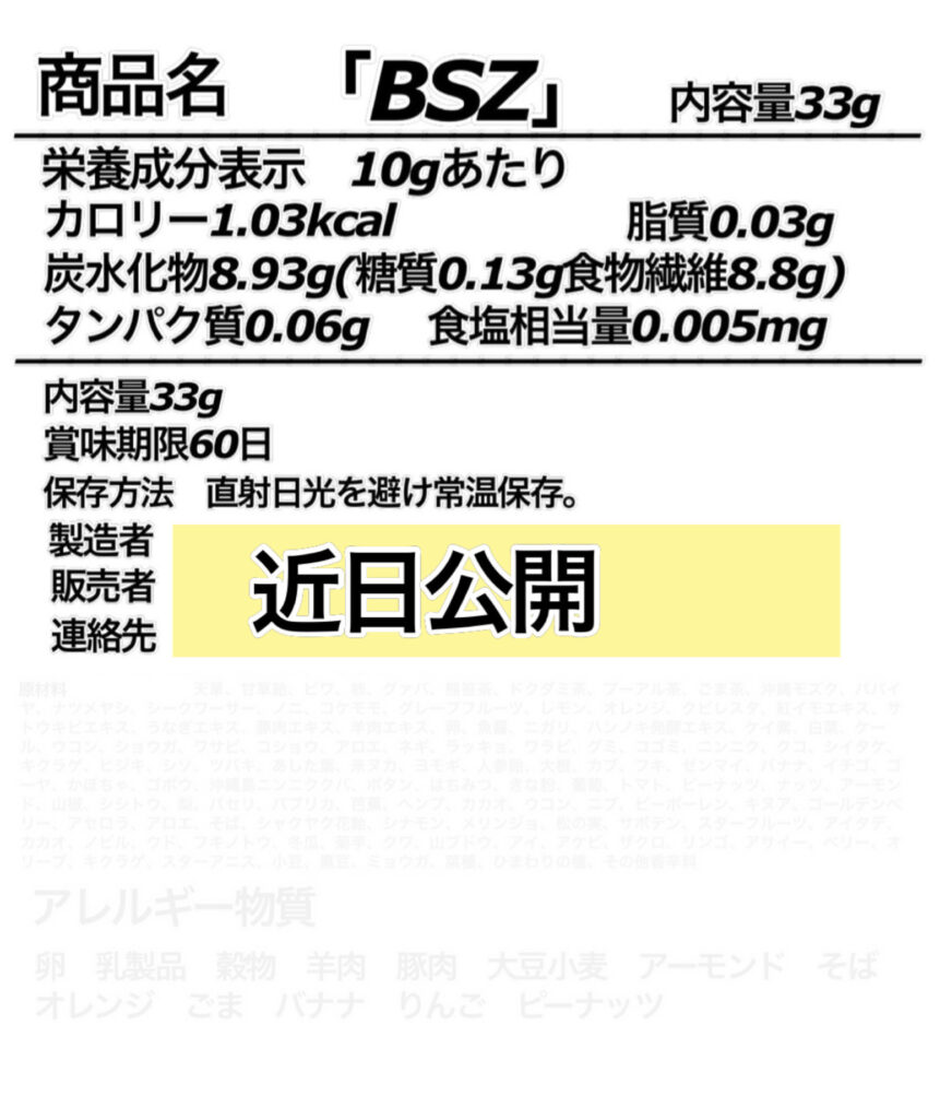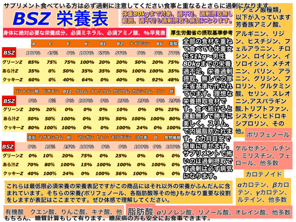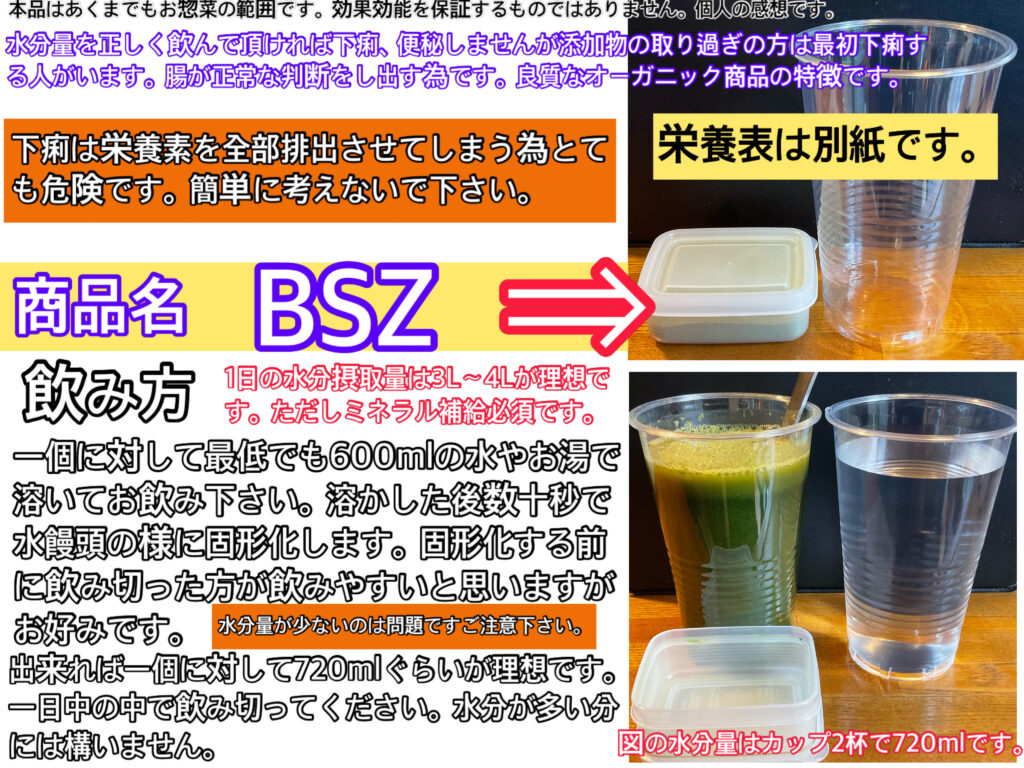○BSZ(水をプラスして飲むお惣菜?ドリンク?)…これは下痢の方、便秘の方に朗報な商品で、両方させません!腸内環境の整理をしながら、色んな栄養素の役割を隠れてする様にしてあるので、かなり重要な商品の1つにもなります。人体の老化、若返り、回復、酸化、健康、精神、全てに関わってくる腸内環境を一気に整えてくれる魔法の食べ物です。魔法力がすごい分だけ、まずさもスゴイです。苦しみに近いくらいマズイかもしれません。しかし、絶対に重要なのです。私自身も飲んだり食べたり毎日していますが、覚悟の力を毎回ちょっと使っています。結果は天国へ通じています。プロセスは地獄と言わざるを得ないでしょう。最近、さらにパワーアップさせたので、天国も地獄も両方パワーアップしてしまいました。話は戻りますが、下っ腹がぽっこりお腹の方は実は栄養不足でこの栄養を充填させる為、ポッコリが早い人で2日、遅い人で1週間でへこんで無くなります。(宿便を取っているので、宿便の量で日数が変わります。)緩やかですが、この栄養素たちだけでも、ごくごくゆっくり血糖値・酸化・血圧も同時に変化していく人が多いです。BSZで腸内環境が整備されると、吸収率が変わったり、免疫力が変わったり、老化や傷ついた細胞の修復力や率が変わる為、良いことしか起きません。身体にとっての最高なベースとしての必須1条件が揃います。この人がいないと始まらないというくらいの相方役者です。糖尿病対策品。