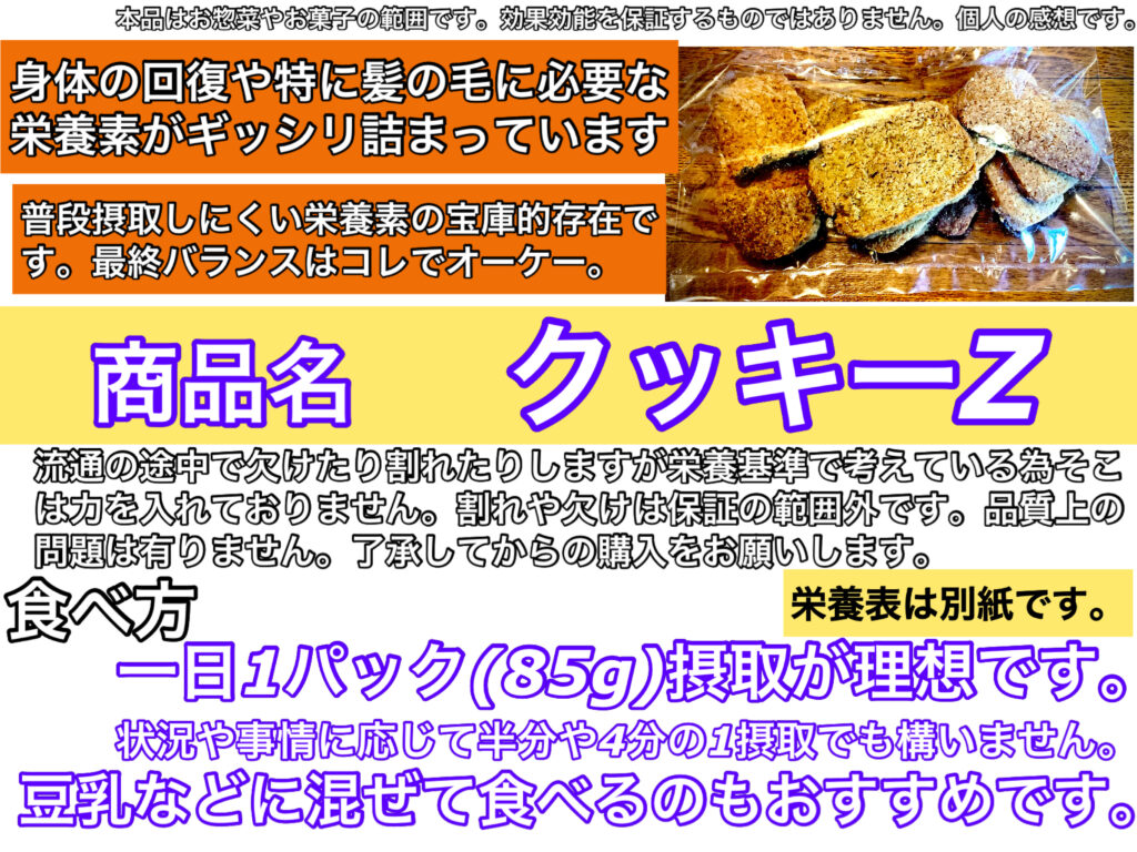○クッキーZ85g 糖質3g…糖質対策クッキーです。当然、糖尿病の方も重宝します。コレのみでは無いですがハゲや白髪を改善させる栄養素の固まりです。コレは重要です。あら汁Zと組み合わせると凄いです。私もコレにお世話になりました。