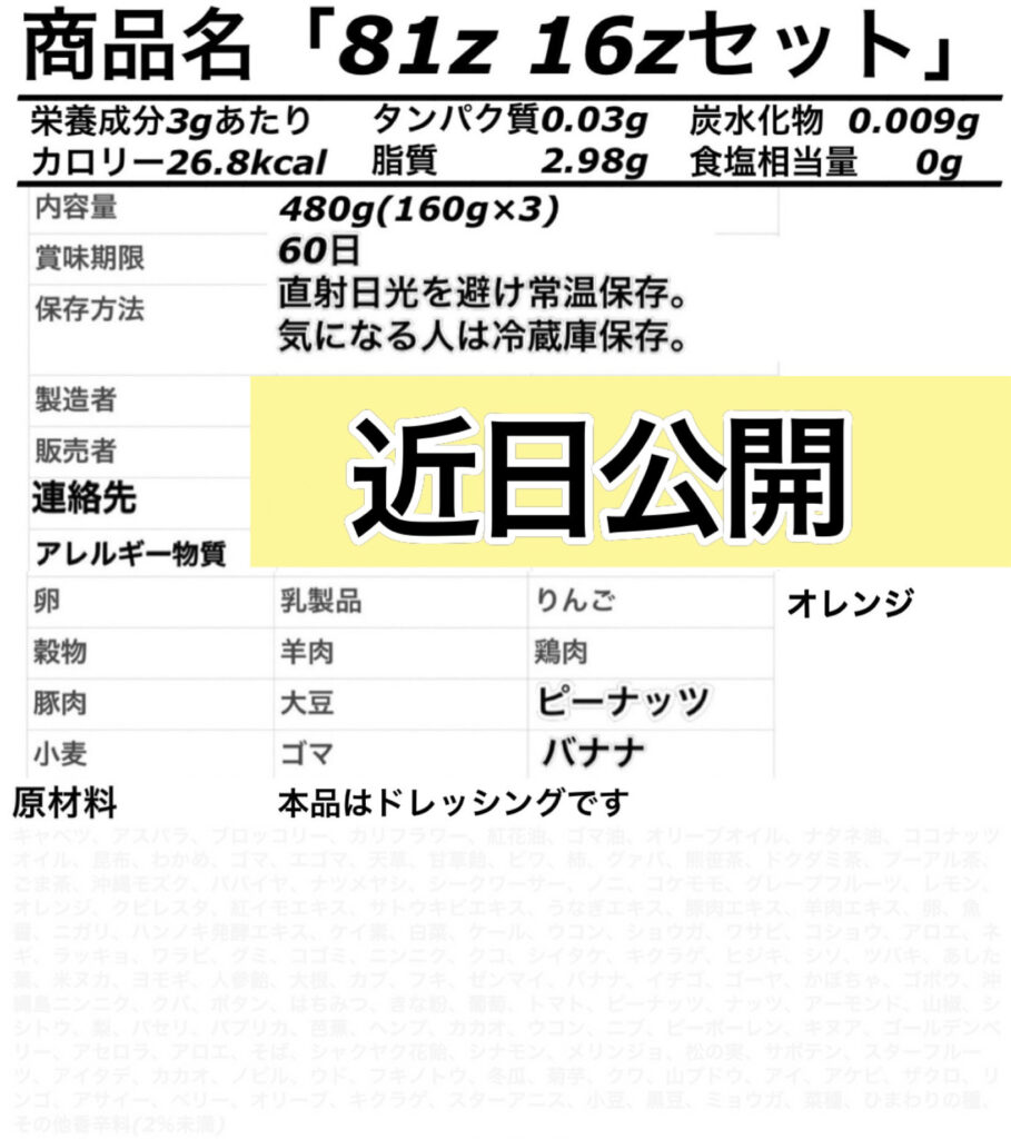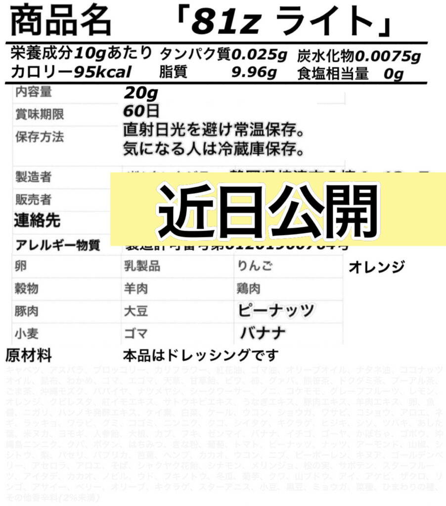 ○81Zライト(ドレッシング)…81Zを薄めて配合してある為、安価になりました!歌を歌っている途中に飲むと、10秒くらいで声が更に出る様になります。コツは少しずつ喉にからませるように飲んでください。当然ドレッシングなので、豆腐やサラダなどにかけて元気を呼び込む食材です。喉が痛い時、こまめに舐めるように少量ずつ飲み続けるだけで、喉の痛みや炎症たちを治す為の栄養材料がこの食材で揃うので、お身体さんが勝手に治してくれます。見えない栄養重要ですね!