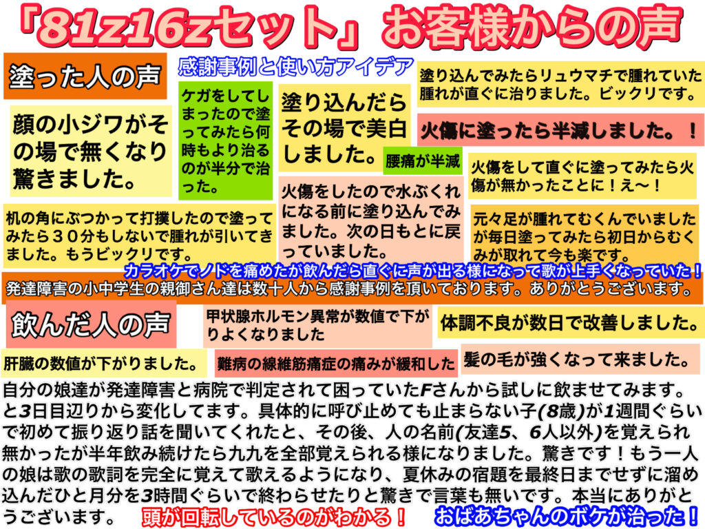 ○81Z・16Zセット(ドレッシング)…開発品中の究極傑作の一つ。全ての食事の中にこれが入っています。当然、結果として他の栄養素との協力で免疫を上げる為の必須栄養材料です。