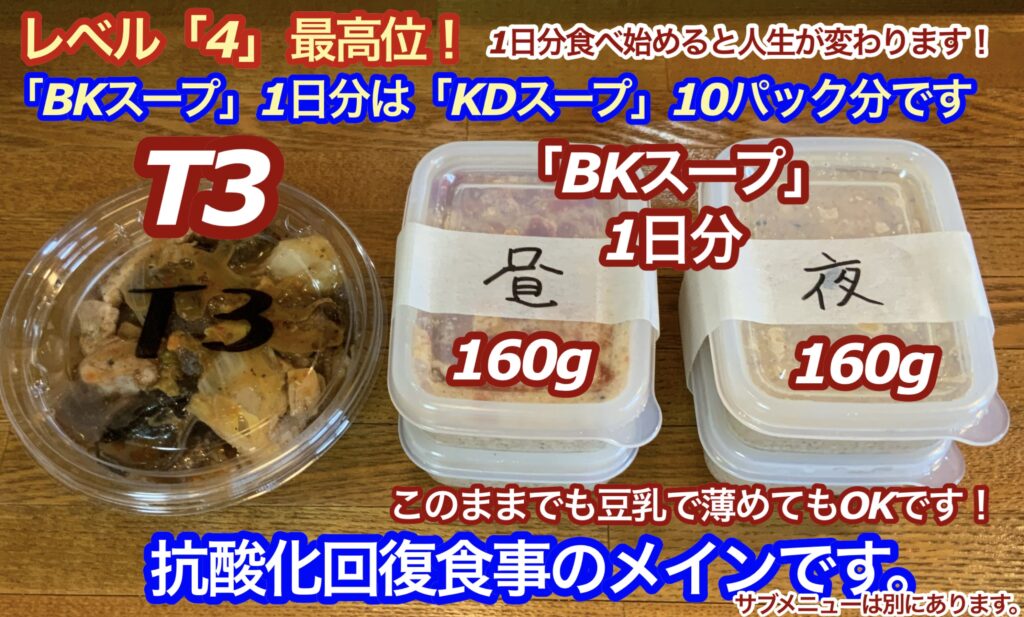 ○抗酸化回復食事セット(BKスープ、T3、グリーンZ50%、BSZ50%など)…それぞれのみなさんを幸せに導く為の究極食事です。人生が変わります。3〜6日間のセットコースをおすすめします!食事前(スタート前)の決めポーズの写真を残しておく事がコツです。3〜6日後同じ決めポーズで写真を撮って下さい。こんな短期間でも変化が顕著です。栄養バランスを重視した「一矢流」の真骨頂がここにあります。究極の栄養バランス!「答えは身体全体にとってのバランス!」まずは体験をお勧めします!