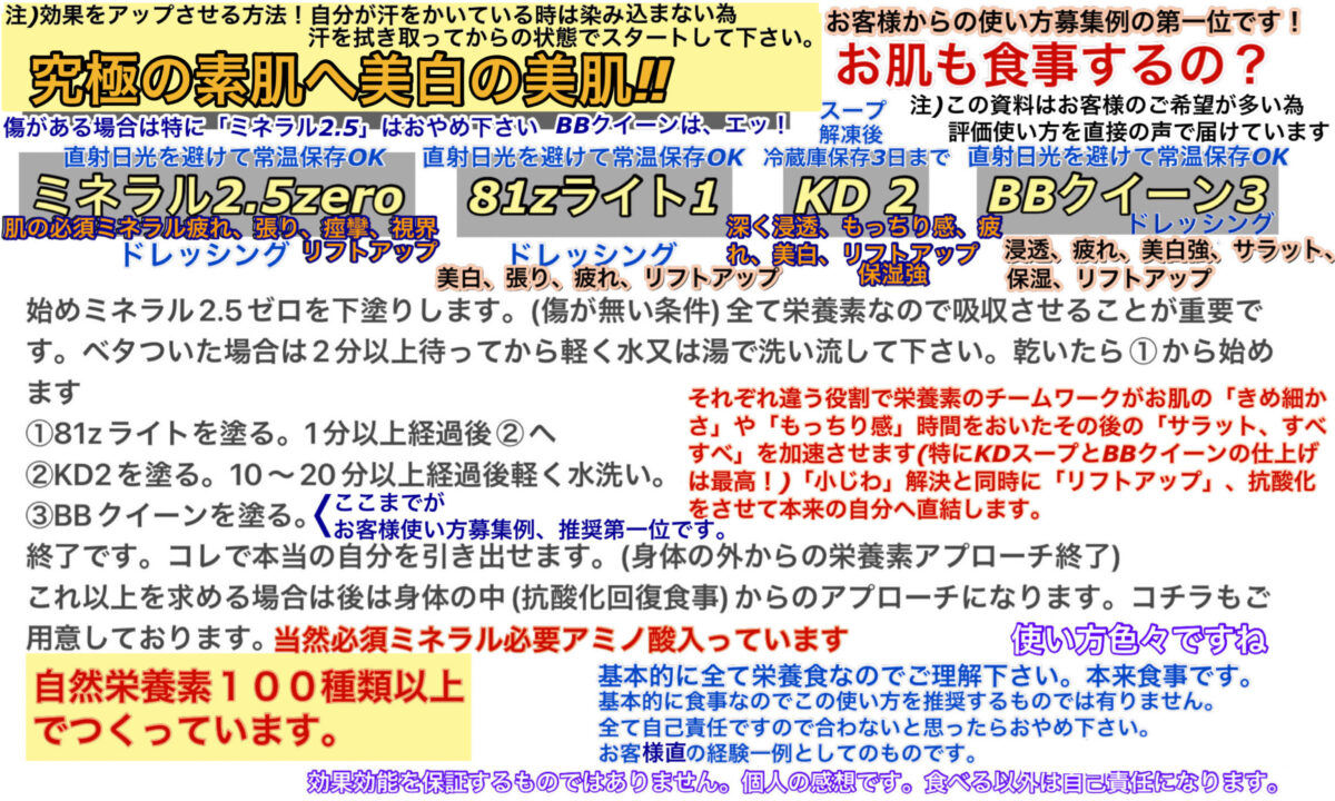 ○十代美人…「81z」を薄め加工した商品の「81zライト」を更に加工した数秒でお肌を美白しスベスベにするオイルドレッシングです。良い商品ですが、今はそれ以上のBBクイーンやKDスープ等が開発出来たので、商品としては存在しますが、開発者としてはアプローチ角度は違いますが「BBクイーン」「KDスープ」等をお勧めします。