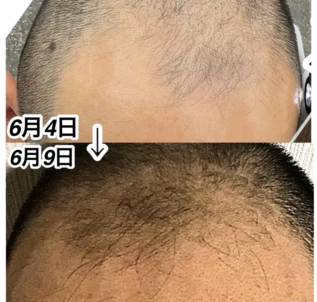 写真をアップして見て頂けるとよく分かりますが、前髪の方に長い髪の毛たちがこの数日で既に存在しています。まだ中間報告ですが、ご本人様も大変驚いて喜んでおられます。発芽をできる状態になったなら、「UTオイル」での促進を促しているだけでも、「UTオイルZ」でのメンテナンスだけでも、どちらでも育毛はされていくので、とりあえず安心と言えるでしょう。ストレスを溜めずに、ゆっくり出来れば8時間目安で寝て頂けるとより一層効果的に育毛されていきます。今の段階では、ご本人様のイメージよりも良い結果が出ていて、ご満足頂けている様なので、良かったですね。ありがとうございます。引き続き宜しくお願い致します。