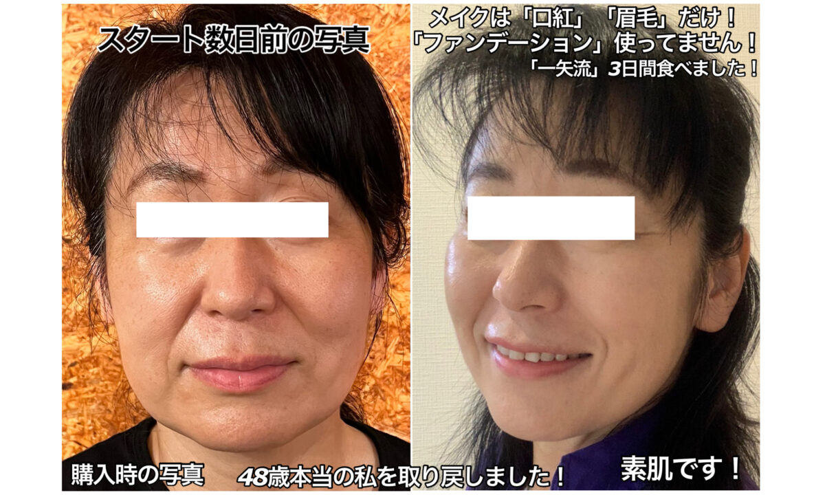 本人確認とっていませんが、多分、最初にお話しした時に「ホームページ全部見ました。」と言われていたのでメカニズムを理解されたのでは?と思われます。「一矢流」は「運動無し」ですが、食事に気をつけて「軽い運動」と併用されたと思われます。ひょっとしたら「一矢流」レベルに腸内環境が既に出来ているかもしれません。10月4日の写真は「お風呂上がり」の「ノーメイク」です。お見事です。