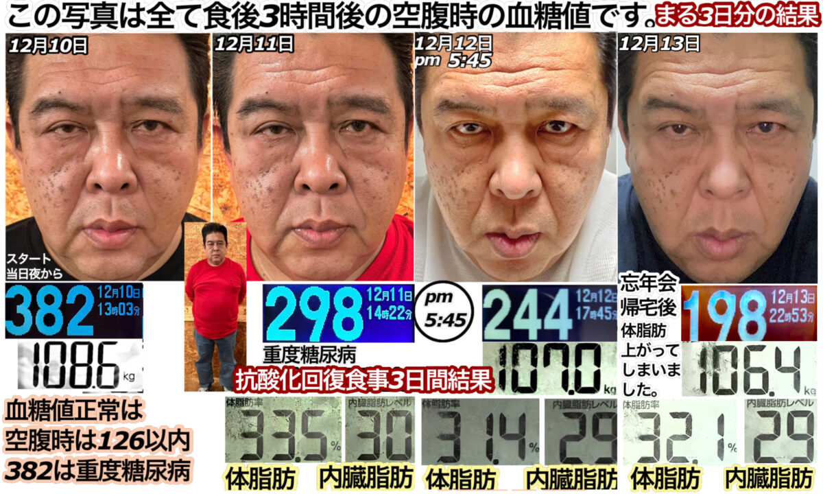 上の写真の左下に書いてある通り、正常の人の空腹時血糖値は126以内ですが、彼の場合は382でメーターが振り切りレッドゾーンです。“ヘモグロビンA1c”にするとヘモグロビンA1c14を超えて、本来はヘモグロビンA1c15と判断される数値です。(通常の人はヘモグロビンA1c5前後が目安になります。)ここでちょうど「抗酸化回復食事」2日分を完食した後の空腹時血糖値になります。スタート時、食べ始めたのが夜なので今現在が夜前なので完全に2日間の結果データになります。初日の体脂肪と内臓脂肪の数値は測れませんでしたが、次の日の丸一日の変化は目を見張るものがあります。1番減らない内臓脂肪も30➡︎29へ下がって減っています。体脂肪33.5%➡︎31.4%まで1日で減っています。体重においては、空腹なく普通に食事をとっていますが、丸2日で−1.6kg痩せています。血糖値は、382➡︎244まで変化しました。同じ空腹時血糖値なので初日はもしこれが満腹時血糖値だったらと思うと、完全に400を超えているのでゾッとします。まだまだですが、だいぶ安全圏の方向に傾き出しました。ここまでは「一矢流」的には順調な回復をしていて予測の範囲です。この時点で病院の場合は、2日なので絶食をさせても同じ空腹時血糖値で360にも減りが届かない状態です。私自身が当事者だったので思い出します。それだけ高血糖は厄介なものです。短期間でここまでの変化が出来て良かったですね❗️通常、病院でもお腹いっぱい食べながらこういう結果にはならないので、これが普通だと思わないでください。「一矢流」以外ではこうはなりません。(インスリン注射をした場合は別ですが。)