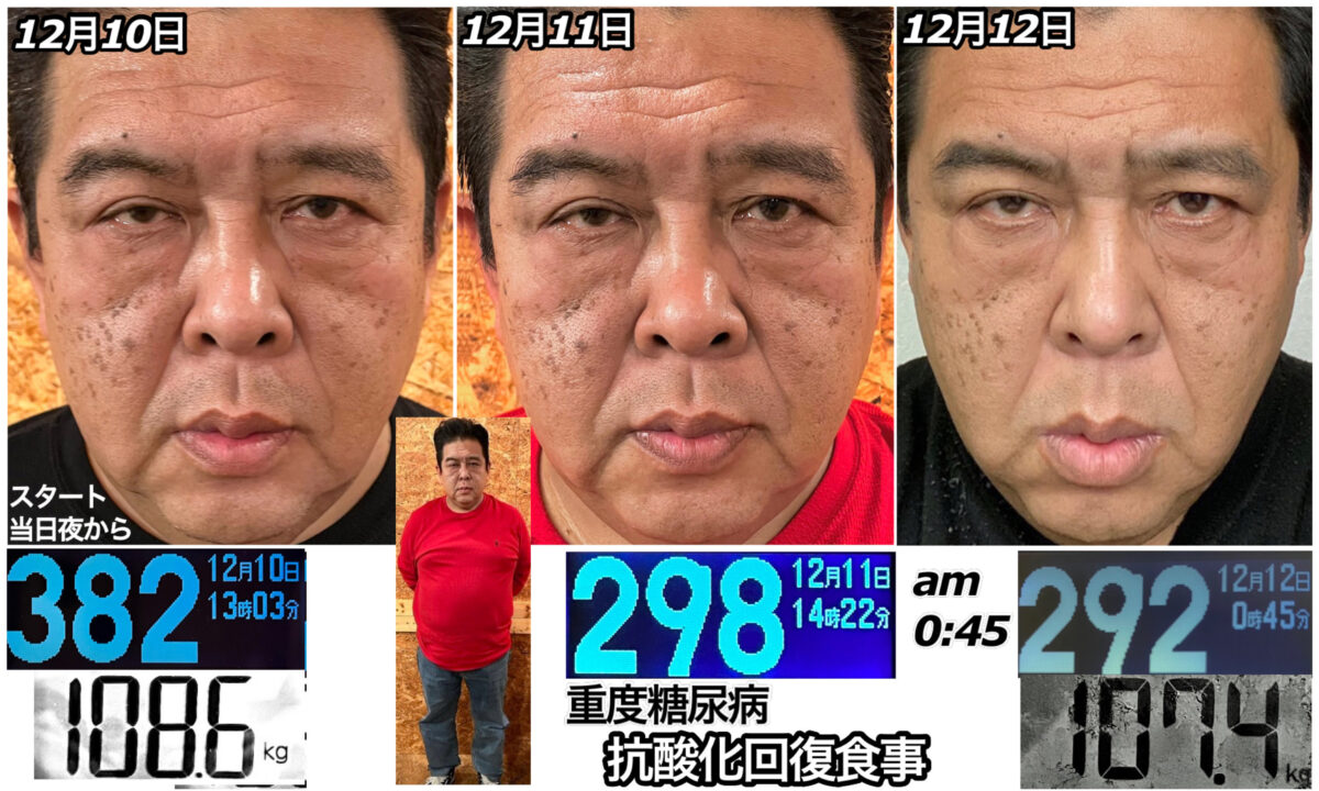12月10日に購入に来られた日の夜ご飯から始めました。12日は午前の深夜ですが、11日の夜ご飯が終わってから3時間後の写真・データです。なので12日と書いてありますが11日の結果です。食べた24時間以内に浮腫んでいますので(11日)、今までがカロリー・脂質・炭水化物オーバーの完全栄養不足だった事が伺えます。「お身体さん」がキチンとした栄養が入ってきたぞ!と気づいて、栄養を逃がさないように頑張っている状態がこの浮腫になります。本来身体がもう少し弱いと、ここでキチンとした食べ物を誤認して下痢を起こすのが添加物や化学物質漬けの身体になります。大抵1日半くらいで下痢は治まりますが、この現象は身体の状態が最悪を通り越している時の状態です。「お身体さん」が下痢をさせる事でリセットします。今回は、下痢もなく正常な状態なのでそこは最悪ではないという事がわかります。もうすでに顔が変わり出して、3日間ぐらいで身体の中が激変します。当然、“血糖値“も正常化していきますが、個人個人身体は違いますので“血糖値”が下がらないボーダーラインが出てくる場合もあります。この状態の人は更に深刻な身体の状態という事が分かりますが、3日間の“血糖値”の推移で大体判断がつきます。“血糖値”が高いという事は、糖によって身体が酸化を強烈にしているという事でありますが、この角度だけでは抗酸化は中途半端です。もう一方の角度の悪玉コレステロールの方の酸化攻略も同時に気にしなければいけません。顔には、糖化によるシミも強く出ています。お腹には内臓脂肪がパンパンなのも見てとれます。先ずは、ご自身がどれだけ状態が悪いかという事を自覚しなければ攻略が出来ません。お話しを伺った時に、色々な兆候が出ていましたので、高脂血症や血栓(悪玉コレステロール)の影響による目詰まり。重金属による目詰まり。炭水化物過多の目詰まり。脳梗塞や心筋梗塞になるリスクを避ける為に、特にお酒・ラーメン・甘い物などは避けた方が良いかと思います。ここから寒くなりますので、温度変化が急に代謝を変えるので危険です。お店で測った時の血圧と脈拍は良かったのですが、ご自宅へ戻られてからの血圧も脈拍も上がっていて良いものではなかったので、身体を温めて、血液を汚さないように気にされた方が良いと思います。寒いと言う事は危ないという事を自覚されると身体を守りやすくなります。