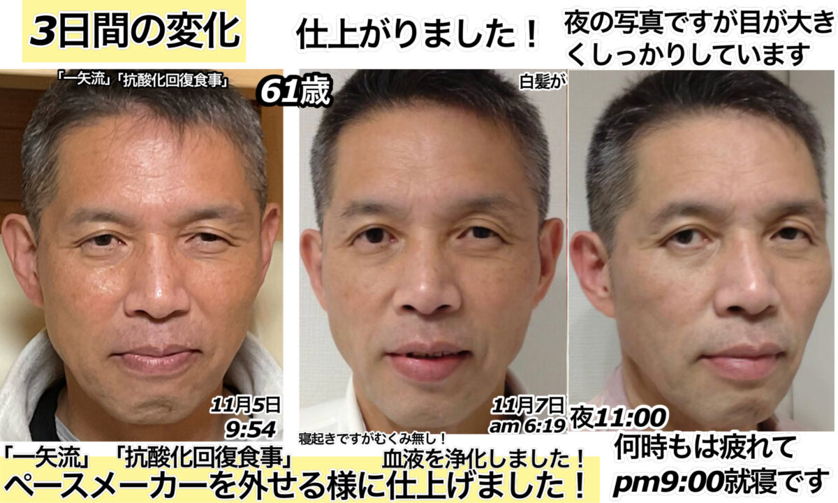上の5日の写真が始まりで、8日の写真が終了の次の日になります。ちなみに血糖値が下がり、抗酸化をしている為、加齢臭はしていません。無邪気な笑顔は可愛いですが、ドスの効いた渋いおじ様から、好青年に変化しています。貫禄の代わりに、好感度と爽やかさがアップしました(モテ期、到来!)。昨日の夜から朝にかけて、身体が痩せた事を受け入れて、馴染んできました。「KDスープ」“自分g”で維持をすれば別ですが、何もしなければ効果は緩やかに下降していきます。3日ぐらいは何もしなくても現状維持をしてくれます。そろそろ手術の日を迎える為、万全な状況作りが出来たと言えましょう。実質年齢61歳ですが、今は体内年齢が46歳に変化しました。「15歳の若返り」に成功しました。「一矢流」から一言だけご注意があります。仕事のお付き合いと称して、若返ったからといって女性遊びは程々にして下さいね。あっ!間違えました。彼はそういう事をしない誠実な社長さんだったことを忘れていました。大変失礼しました。お幸せにお過ごし下さい。戯れてしまって申し訳ありませんでした。本当にありがとうございました。