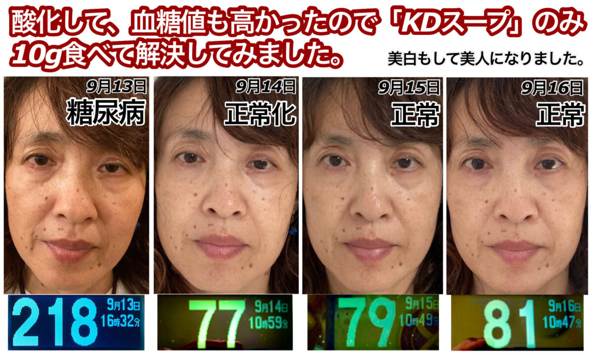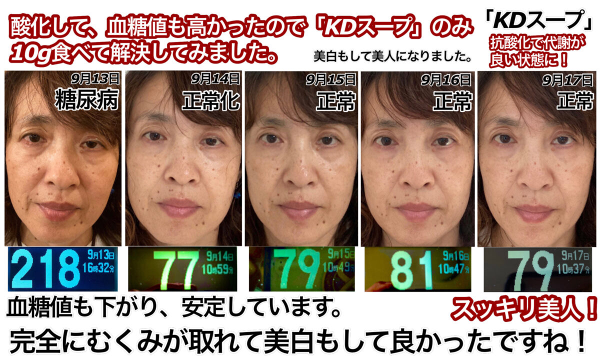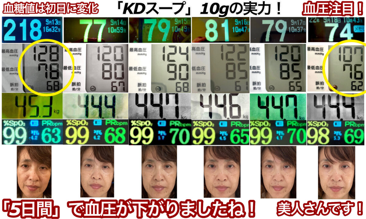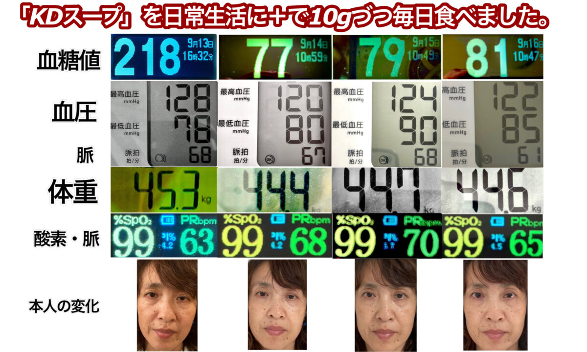 体重45kgなので、「KDスープ」は約10gをいつもの日常生活にプラスして食べただけの結果です。インスリン注射もしていません。薬も飲んでおりません。