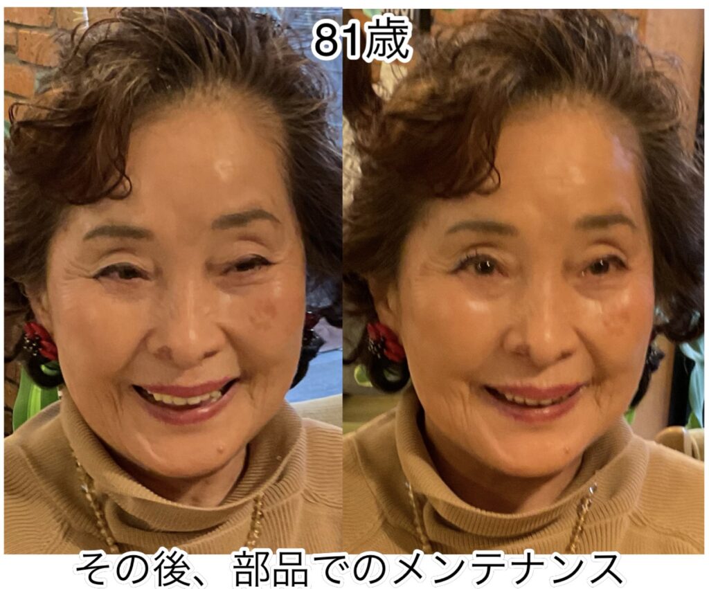 色々な若返りご苦労様でした。追加写真もいただいて、比べやすく助かりました。美しくなる事は良いことですね。また何かお悩みがありましたらお伝え下されば、協力出来ると思います。今回は一先ずお疲れ様でした。ありがとうございました。