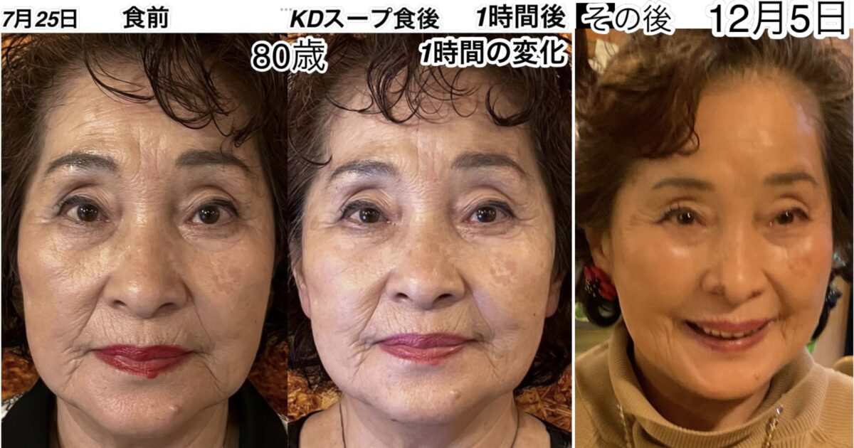 4人の別人に見える同一人物の写真が、目の下からの変化が著しく変わっていきました。今回、ある程度はっきりしてきた事は、ほぼ3〜4日という短期間で80歳でも小顔になれる若返り事実が驚きでした。「KDスープ」の量はさほど飲んでいません。(5日間は10g、残りの5日間は15gです。) 相乗効果の組み合わせで力を発揮した“若返り30%の出力”でしたが、最大限発揮されたのではないでしょうか?完全に女性としてのフェロモンを取り戻して来ましたね。お見事でした。