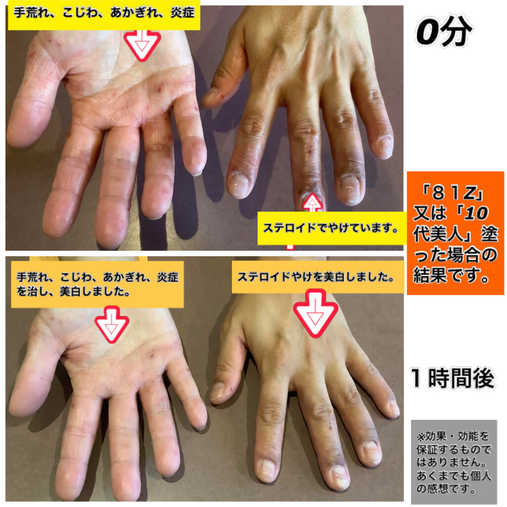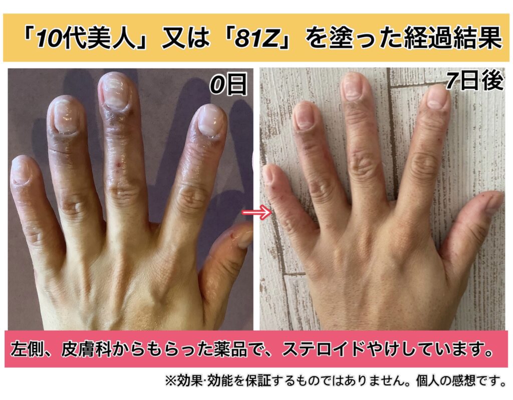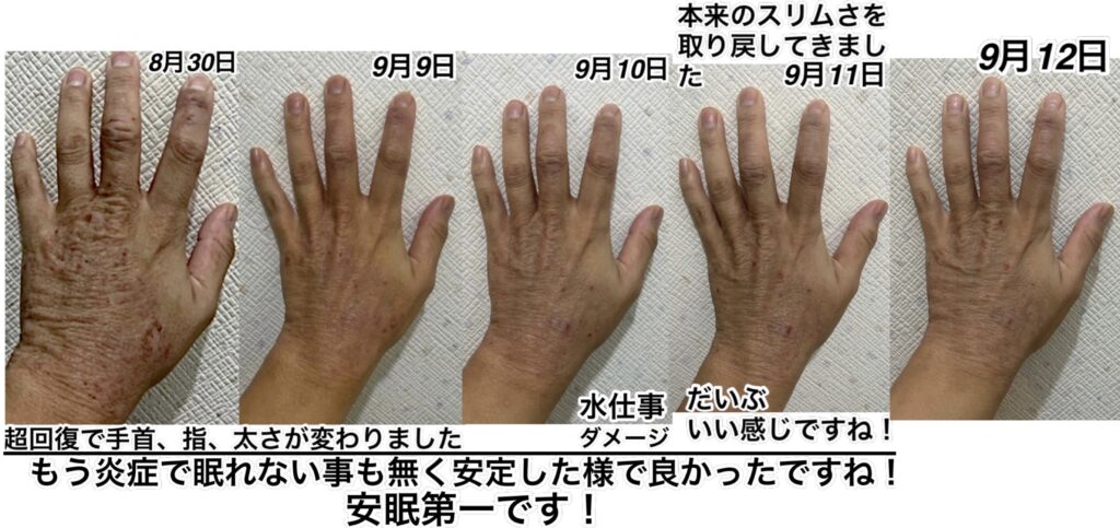 皮膚科では、この状態になるとステロイドを出して終わるため、手はどんどん真っ黒くなり、ステロイド焼けをしてきて、どうにもならなくなってきます。
