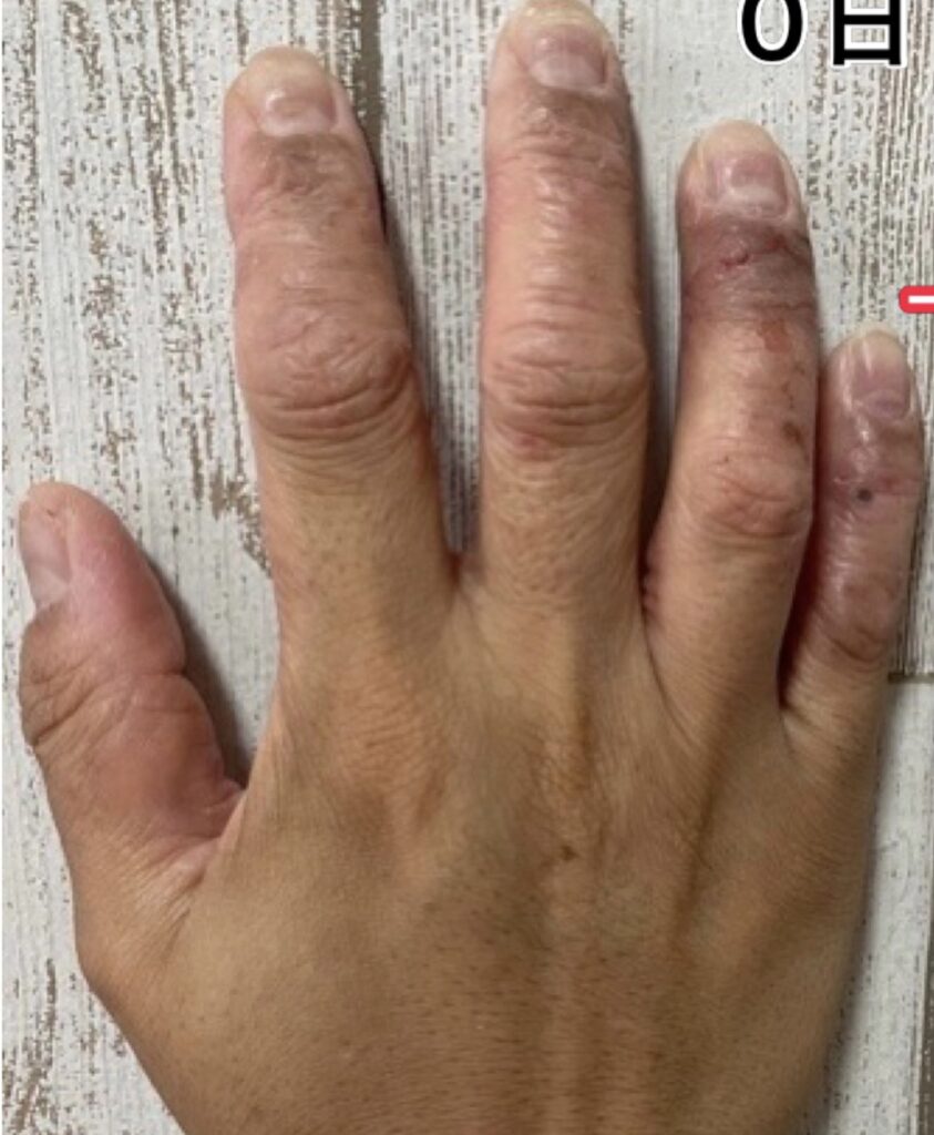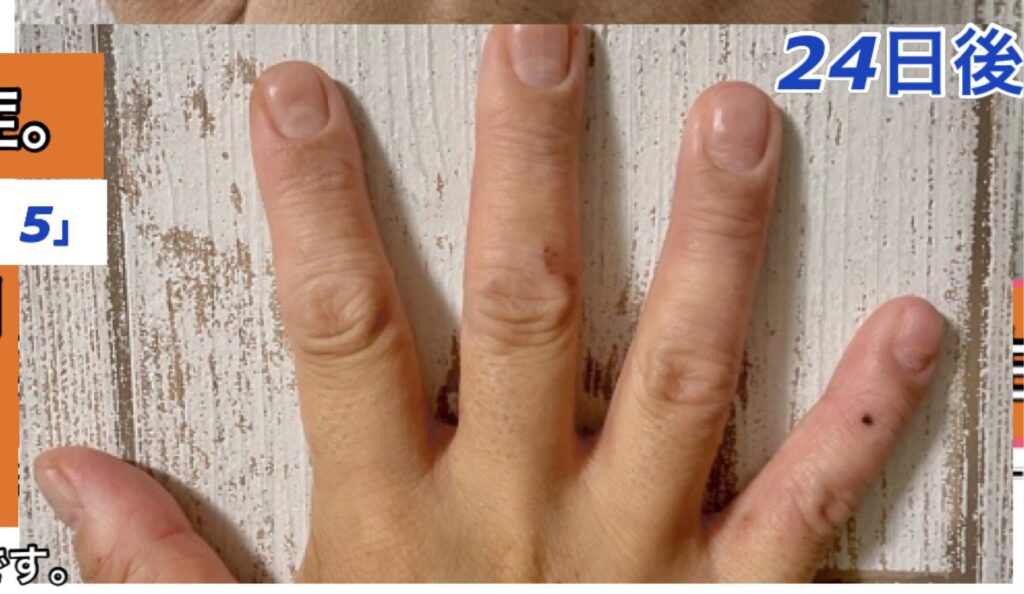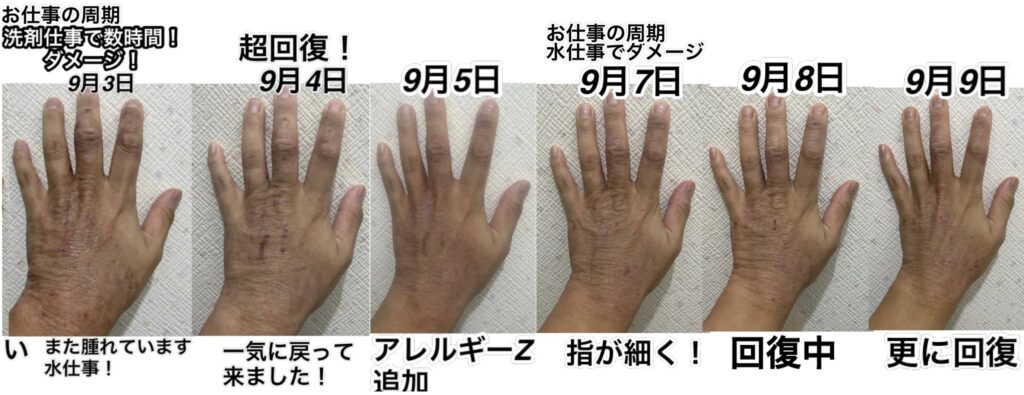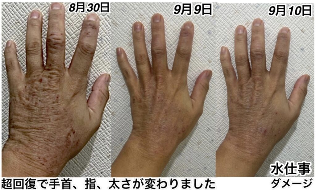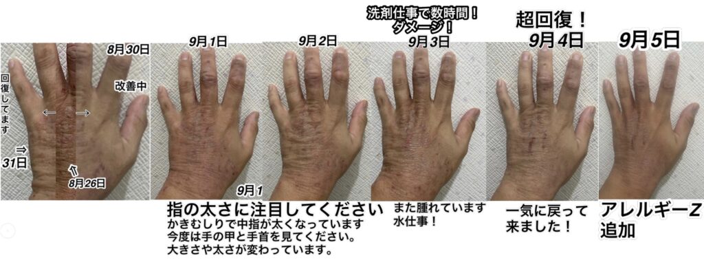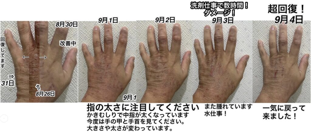 しかし、手の具合を毎日の写真で追いかけるとわかるように、手が荒れてひどくなるその周期に“水仕事をやっている”と言う結論に達しました。しかも最初は素手でやっていたため、ダメージは深刻で、せっかく治りかけてきたものを自分でまた元に戻し、また超回復をして、またダメージを負って、と言うことを繰り返しているのが写真をよく見ていただけるとわかると思います。