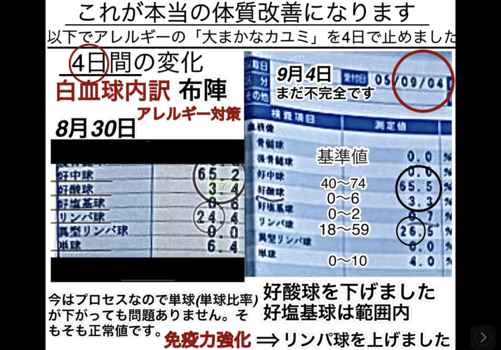 まずは、コレを定着したかは今日の血液検査結果で確認が取れるはずです。そこでの白血球•赤血球の数値変化により、より中心の的へ、血液の布陣が出来るように更なる微調整を行います。