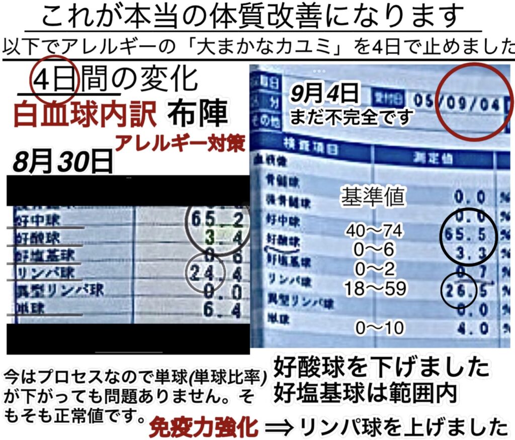 これは皮膚科や病院に行った場合に、アレルギーやアトピーではないよ!と判断される正常な白血球たちの配置配列の比率と判断されてしまう数値になります。