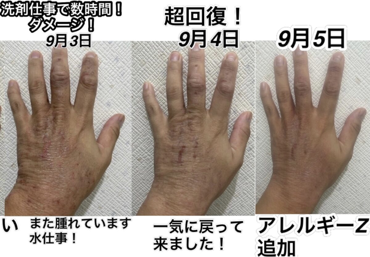 しかし、手の具合を毎日の写真で追いかけるとわかるように、手が荒れてひどくなるその周期に“水仕事をやっている”と言う結論に達しました。しかも最初は素手でやっていたため、ダメージは深刻で、せっかく治りかけてきたものを自分でまた元に戻し、また超回復をして、またダメージを負って、と言うことを繰り返しているのが写真をよく見ていただけるとわかると思います。