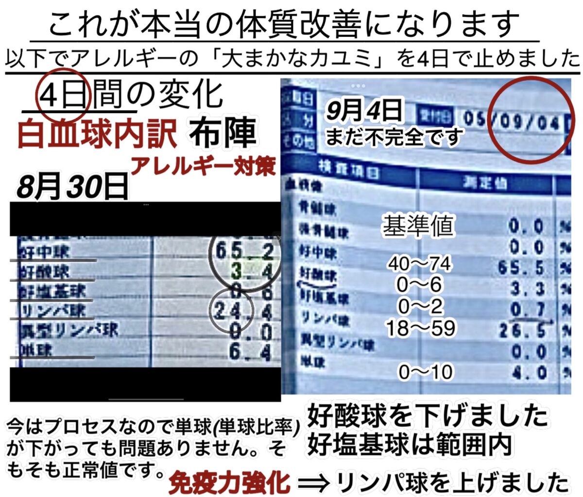 これは皮膚科や病院に行った場合に、アレルギーやアトピーではないよ!と判断される正常な白血球たちの配置配列の比率と判断されてしまう数値になります。