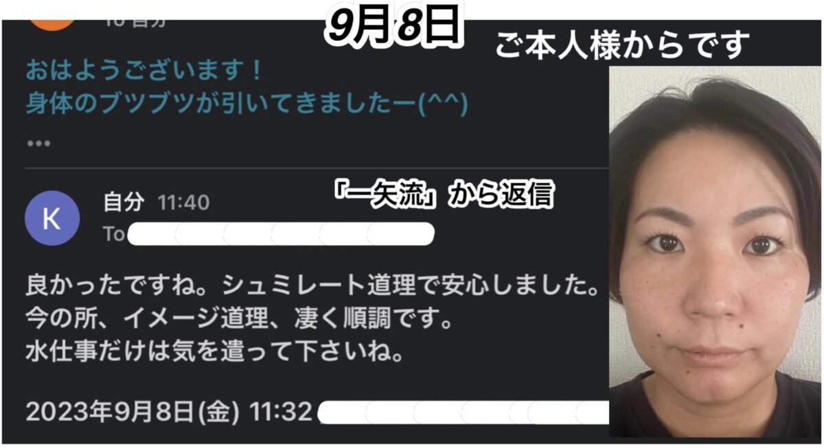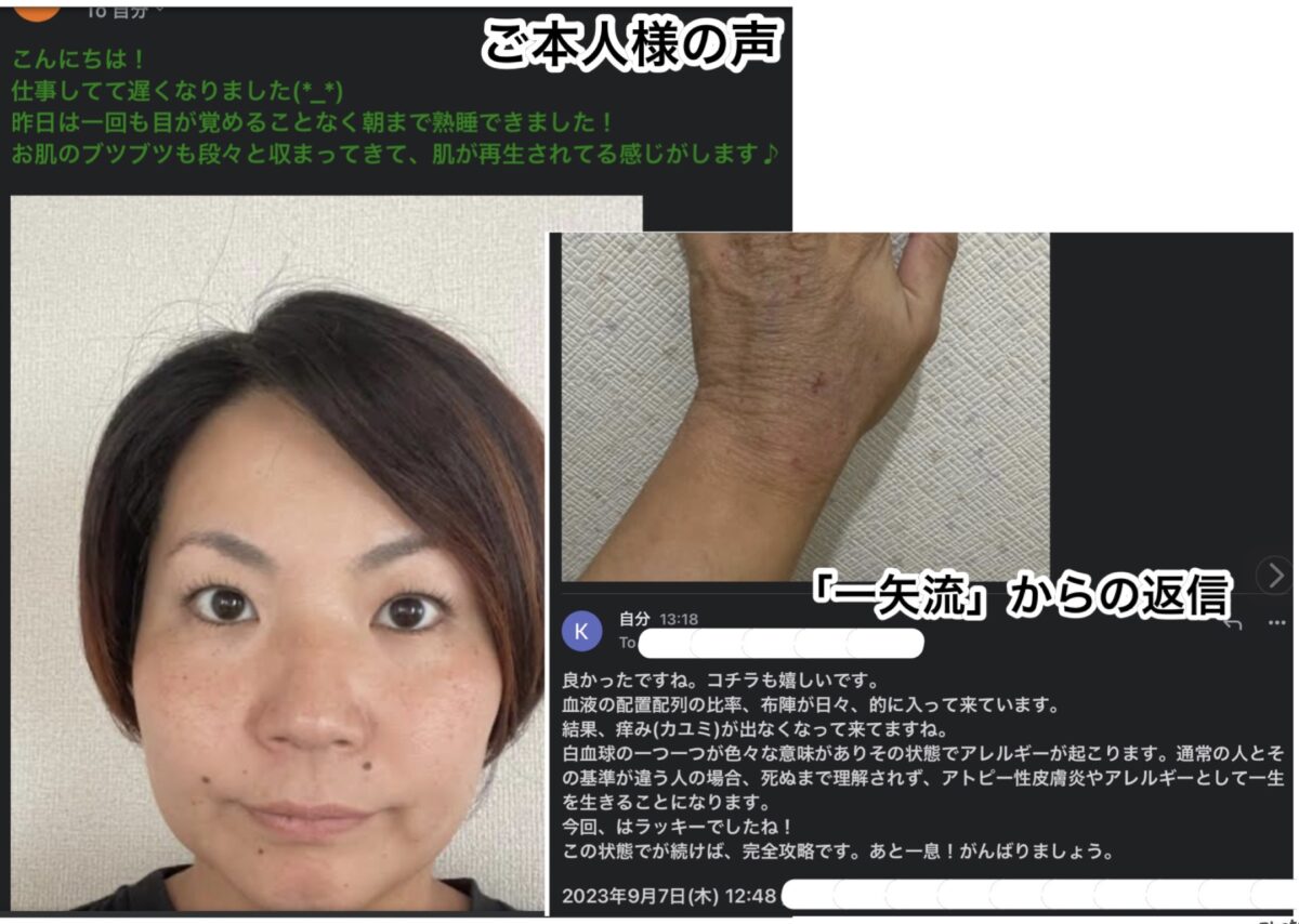 実は彼女も数年前にその状態に陥り、初期の「一矢流」でその真っ黒のステロイド焼けを治していた実績があり、そこから自分なりにいろいろ工夫をして、皮膚科と二人三脚で数年やったのですが、その皮膚科の先生たちや何軒も周ってきた皮膚科の考え方についていけず、結果、ダメージだけが残り、ボロボロになって戻ってきた状態です。しばらく疎遠になり、話しづらかったようで、数年経ってしまったということらしいです。