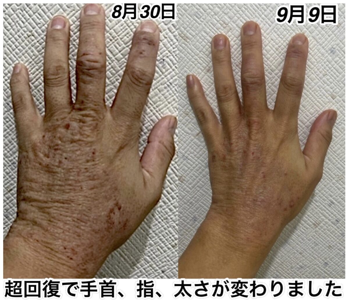 ご覧下さい。指は細くなり、手首も細く戻りました。