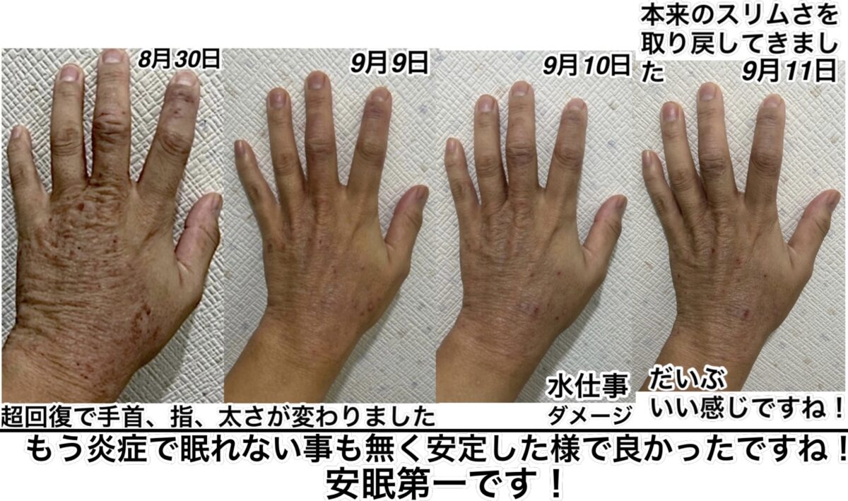 皮膚科では、この状態になるとステロイドを出して終わるため、手はどんどん真っ黒くなり、ステロイド焼けをしてきて、どうにもならなくなってきます。