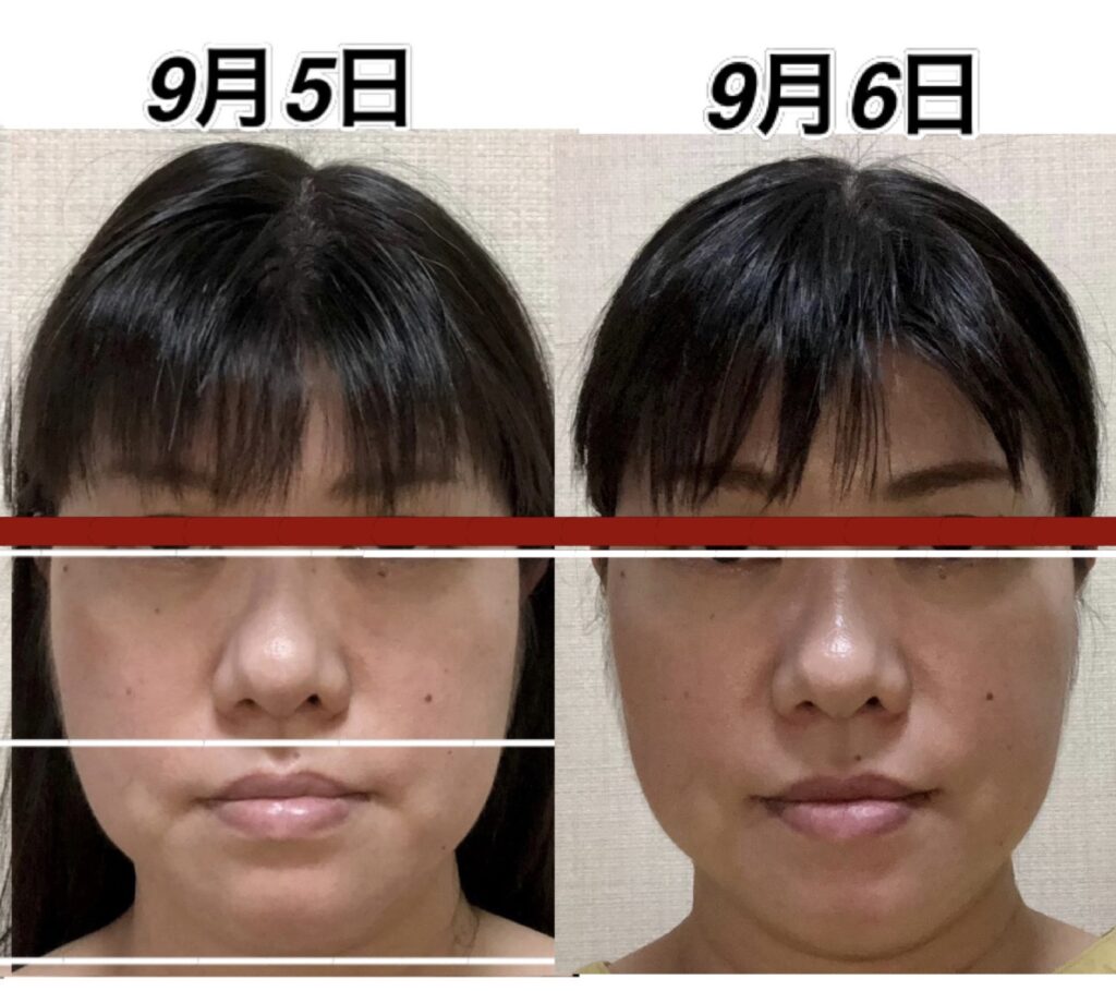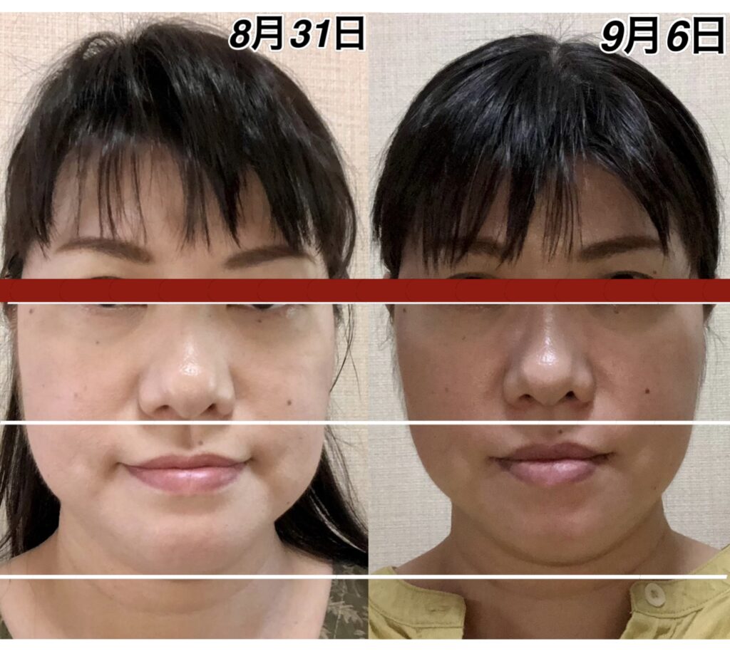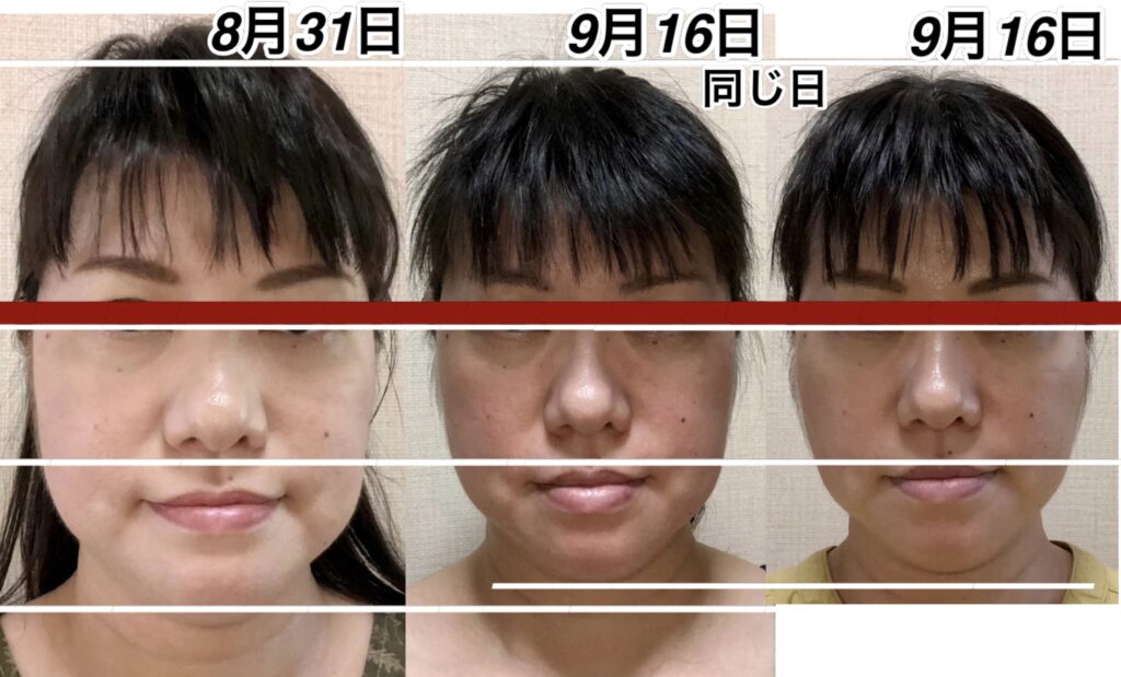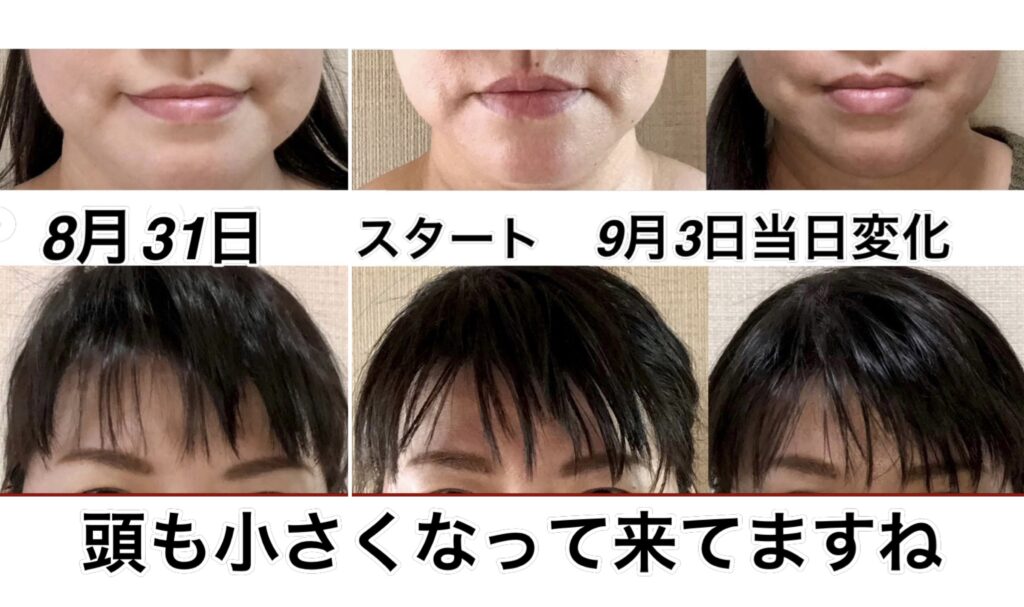 9月12日と9月16日の変化。頭が小さくなりました。さらに鼻も高くなりました。アゴの所の少しのゆとりは、実は明日横幅が細くなるための準備段階に入っている顔です。この日は、縦に小さくなりました。明日は横に小さくなります。これを繰り返して、若返って行きます。