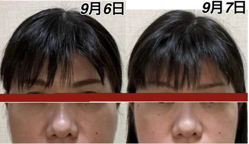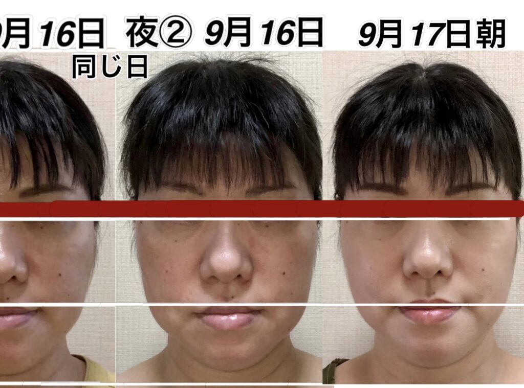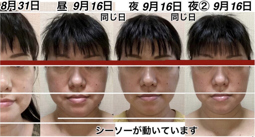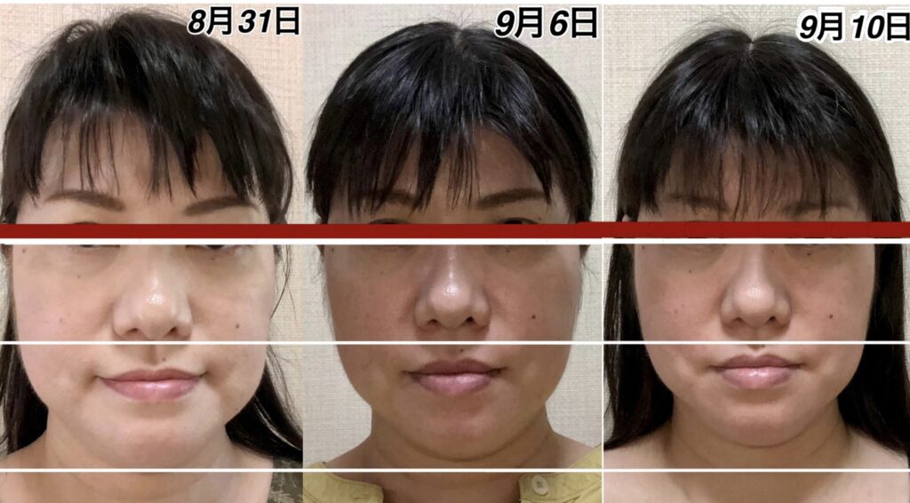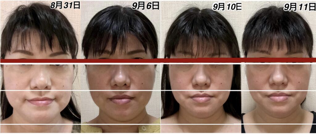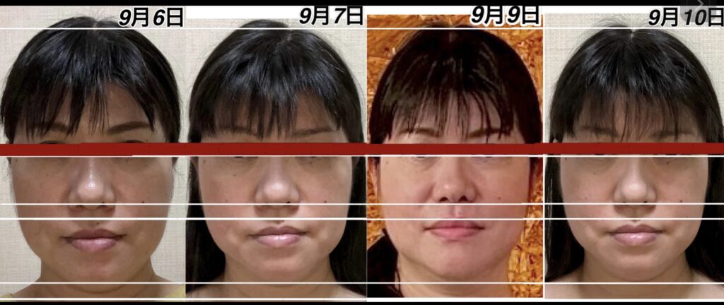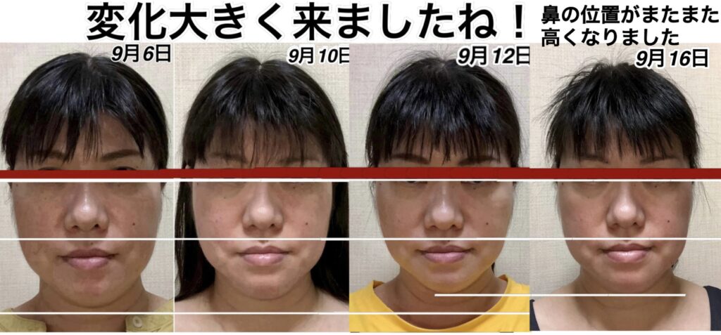 この間、人によっては、疲れは生じてくると、鼻から下が下がります。9月9日の写真を見ていただけるとわかりやすいのですが、この日は1番疲れていないであろう日です。9月10日のアゴの位置とあまり変わらない状態ですが、鼻の位置が1段跳び抜けております。多分、今日、明日、明後日の間に、この鼻の高さの位置まで上がってくるのではなかろうかと、疲労具合によるので何とも言えませんが、予測がつきます。