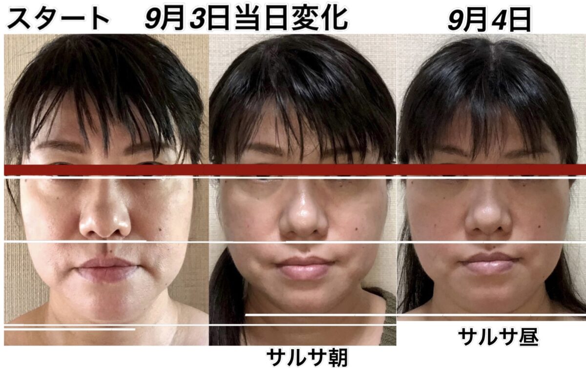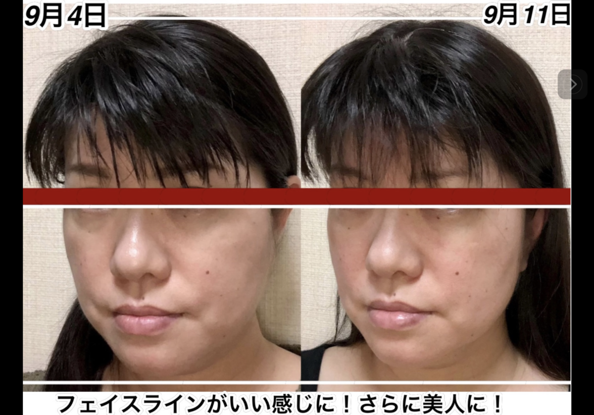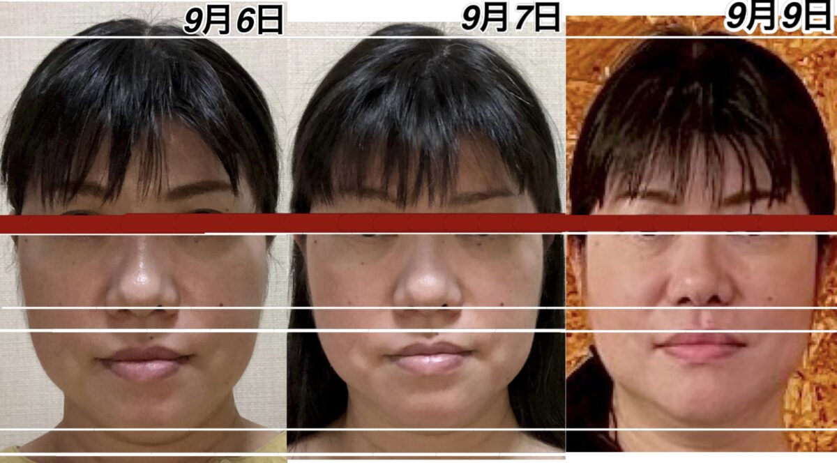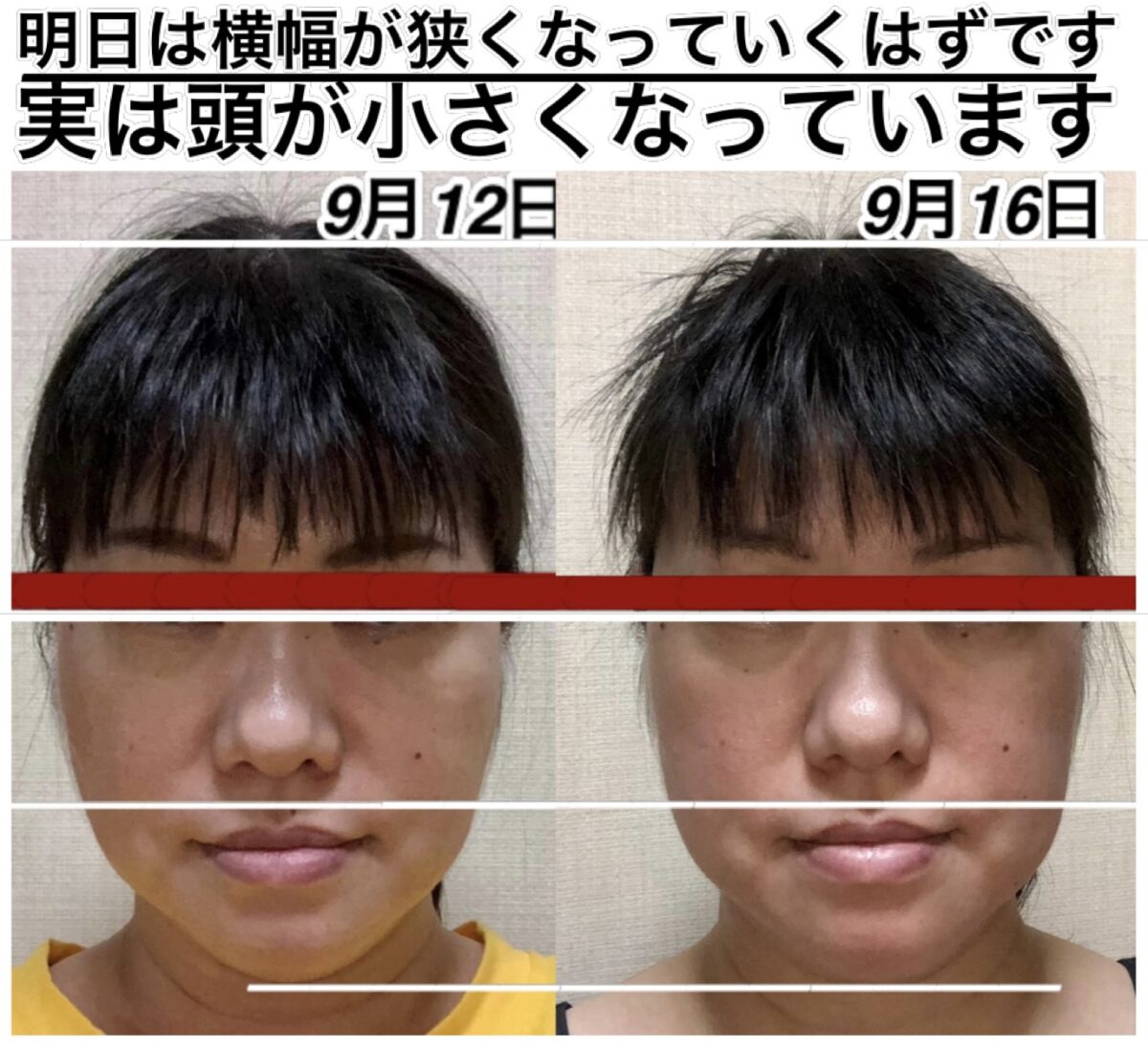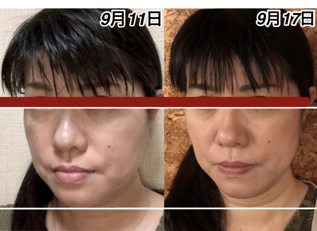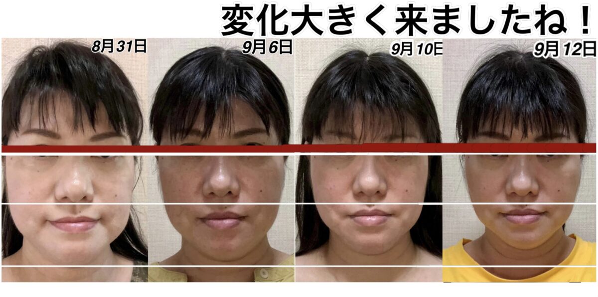 9月12日と9月16日の変化。頭が小さくなりました。さらに鼻も高くなりました。アゴの所の少しのゆとりは、実は明日横幅が細くなるための準備段階に入っている顔です。この日は、縦に小さくなりました。明日は横に小さくなります。これを繰り返して、若返って行きます。