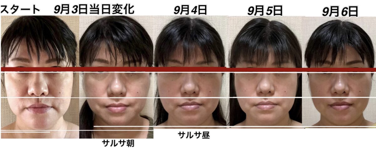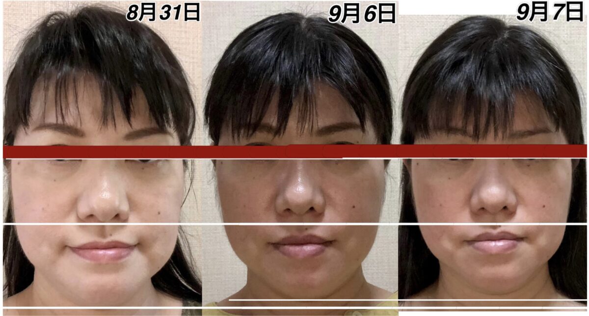 この間、人によっては、疲れは生じてくると、鼻から下が下がります。9月9日の写真を見ていただけるとわかりやすいのですが、この日は1番疲れていないであろう日です。9月10日のアゴの位置とあまり変わらない状態ですが、鼻の位置が1段跳び抜けております。多分、今日、明日、明後日の間に、この鼻の高さの位置まで上がってくるのではなかろうかと、疲労具合によるので何とも言えませんが、予測がつきます。
