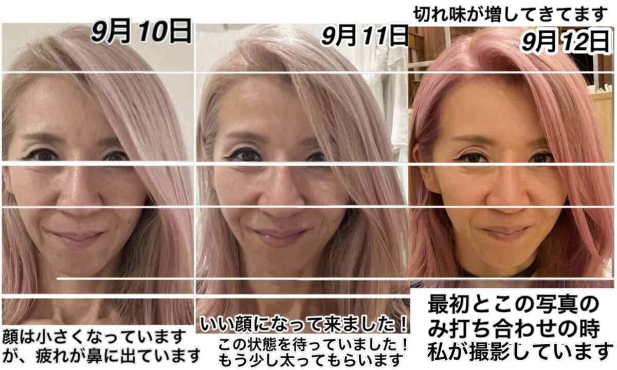 アゴはシャープに上がってきています。もう少し疲れてくると、もっと鼻が下がって大きくなってきます。