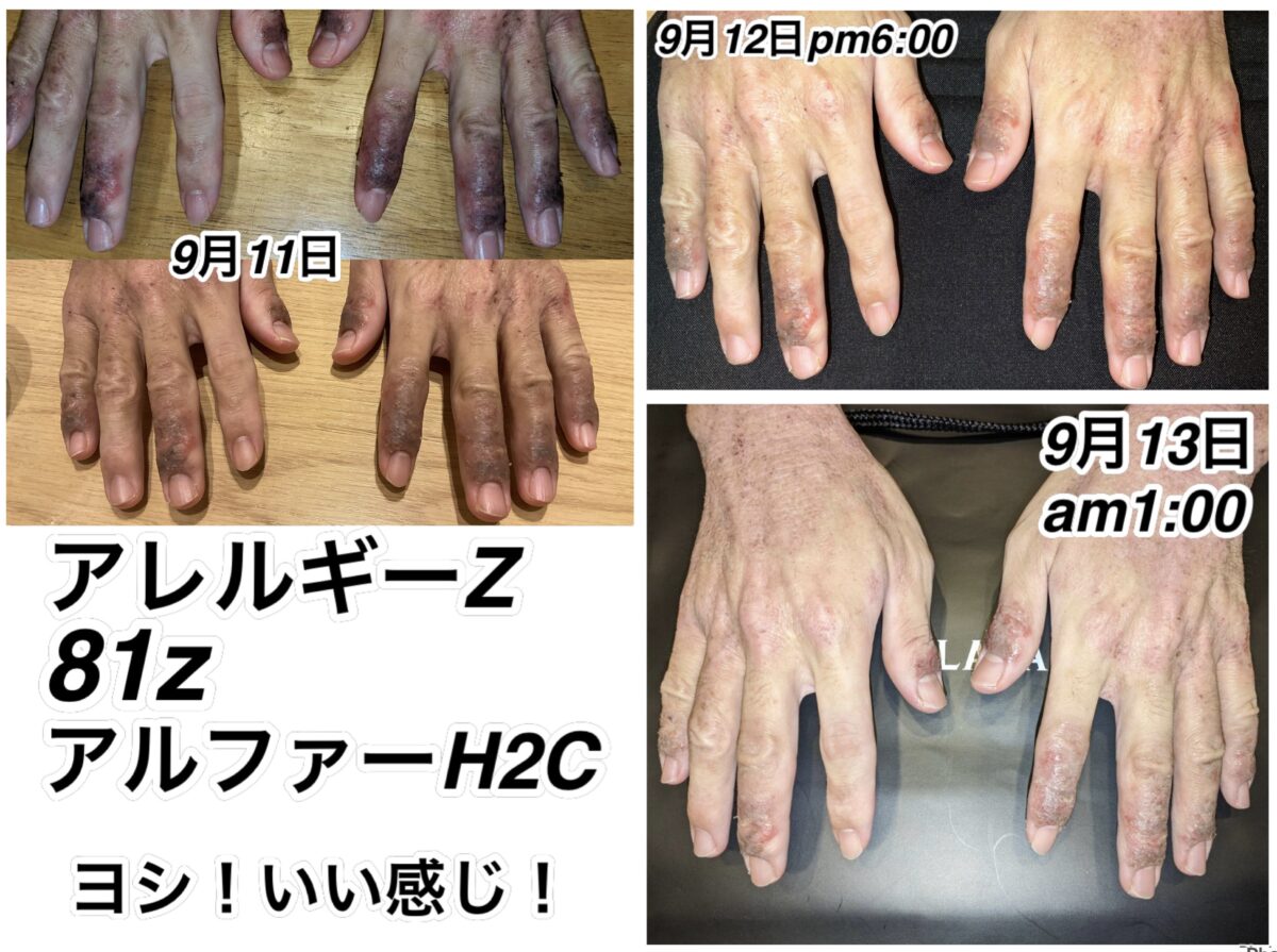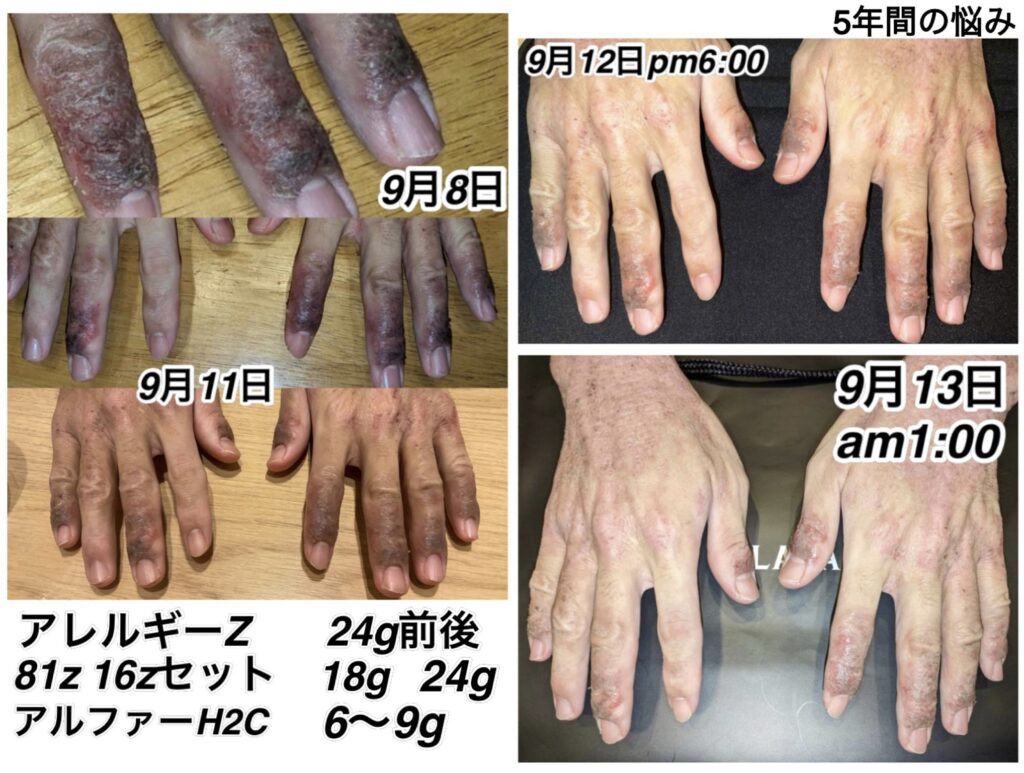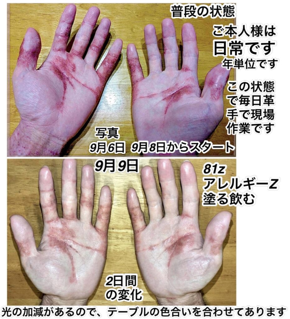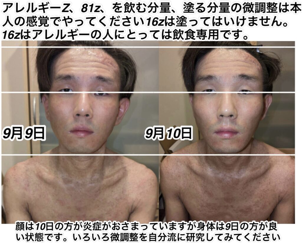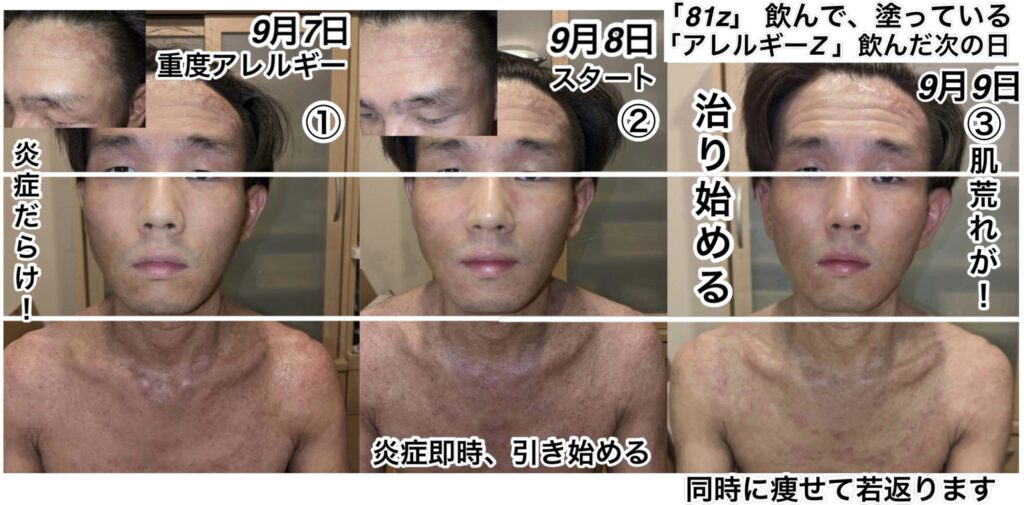 重度のアレルギー持ちです。重度のアトピーとも呼ばれます。「81z」と「アレルギーz」を両方飲んで塗っています。超回復はしていますが、身体の素になる材料が足りません。