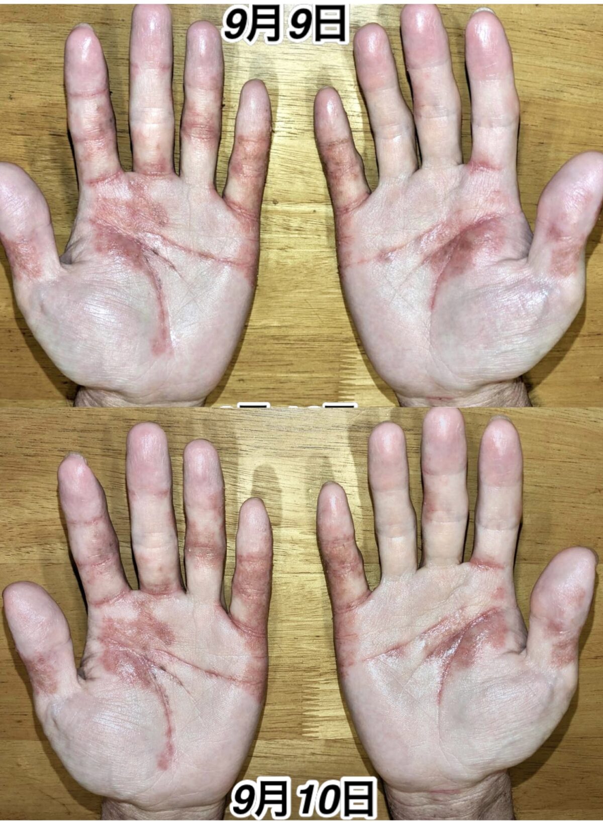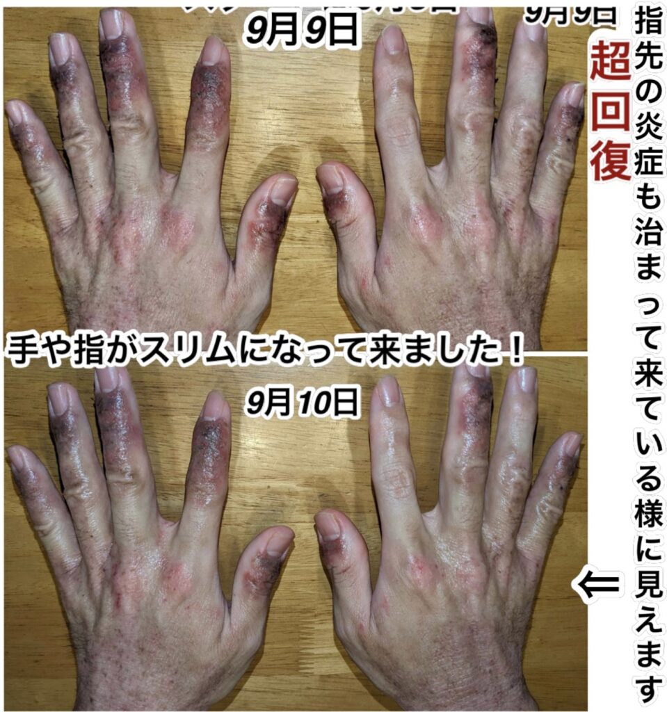 本当は、体質改善から始めなければいけないのですが、あまりにも手を見ていただけると分かるのですが、酷過ぎる為、更にリンパ球が低いと言う事で、穴だらけの炎症が体中の今は、雑菌やウイルスに勝てなくなる可能性を大いに秘めている為、その時点で、数日で重体になり入院をしても治りません。