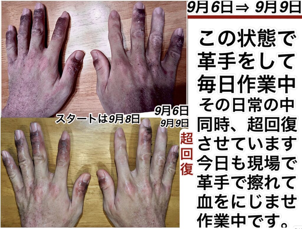 栄養を外から直接吸収してもらうか、飲食によって中から適切に吸収してもらうかのみです。それでも今までの実績として、3000件以上の実績がありますが、改善しなかった人は1人もおりません。ただご満足いただけるかどうかは分りません。良くなることを祈って、こちらはやれることをやるだけなので、ご本人様の方では、少しでも回復できる条件を増やしていただける力をお願いします。本来、仕事をできる状態ではありません。せめて「一矢流」の12日間の内の10日間は、革手をつける作業や大量に汗をかく事、お仕事等は、本来はやめていただきたい。睡眠時間は、必ず8時間以上とっていただきたい。後は、シミュレート通りの食事をしていただきたい。一般食材(ご自分用意)のほうもきちんと厳守していただきたい。が、本来です。