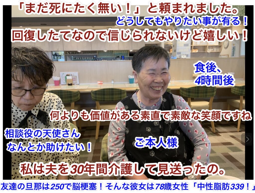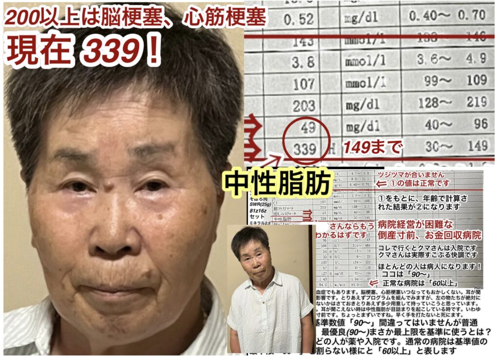 心臓と腎臓も同時に改善し、正常化できるように、彼女に合わせたオーダー品を即座に作り、それを食べていただいた結果の変化になります。心臓の数値もかなり悪く、今回のように脳梗塞よりも心筋梗塞の方が、個人的には心配になるほどの数値です。