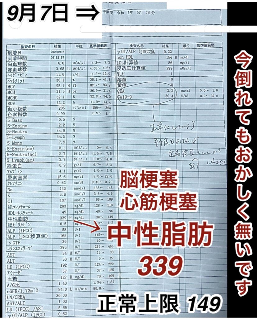 中性脂肪は、9月12日の時点では、339と非常に高い数値を示しておりました。この状況で食べ物を間違えると、当然の結果と言えましょう。