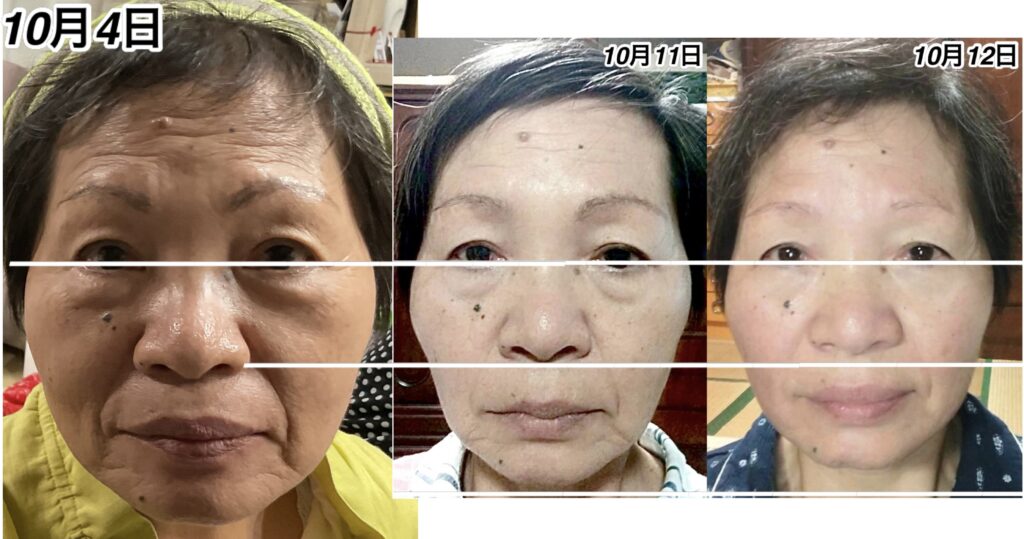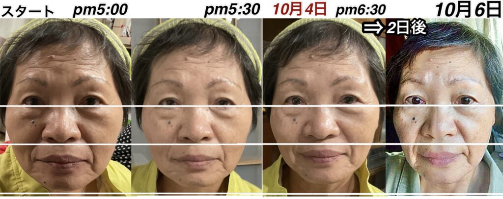 一日で、鼻が上がり、アゴが小さくなっているので、次は横に細くなりますよ。楽しみですね。そろそろ人生が変わったのではないでしょうか。